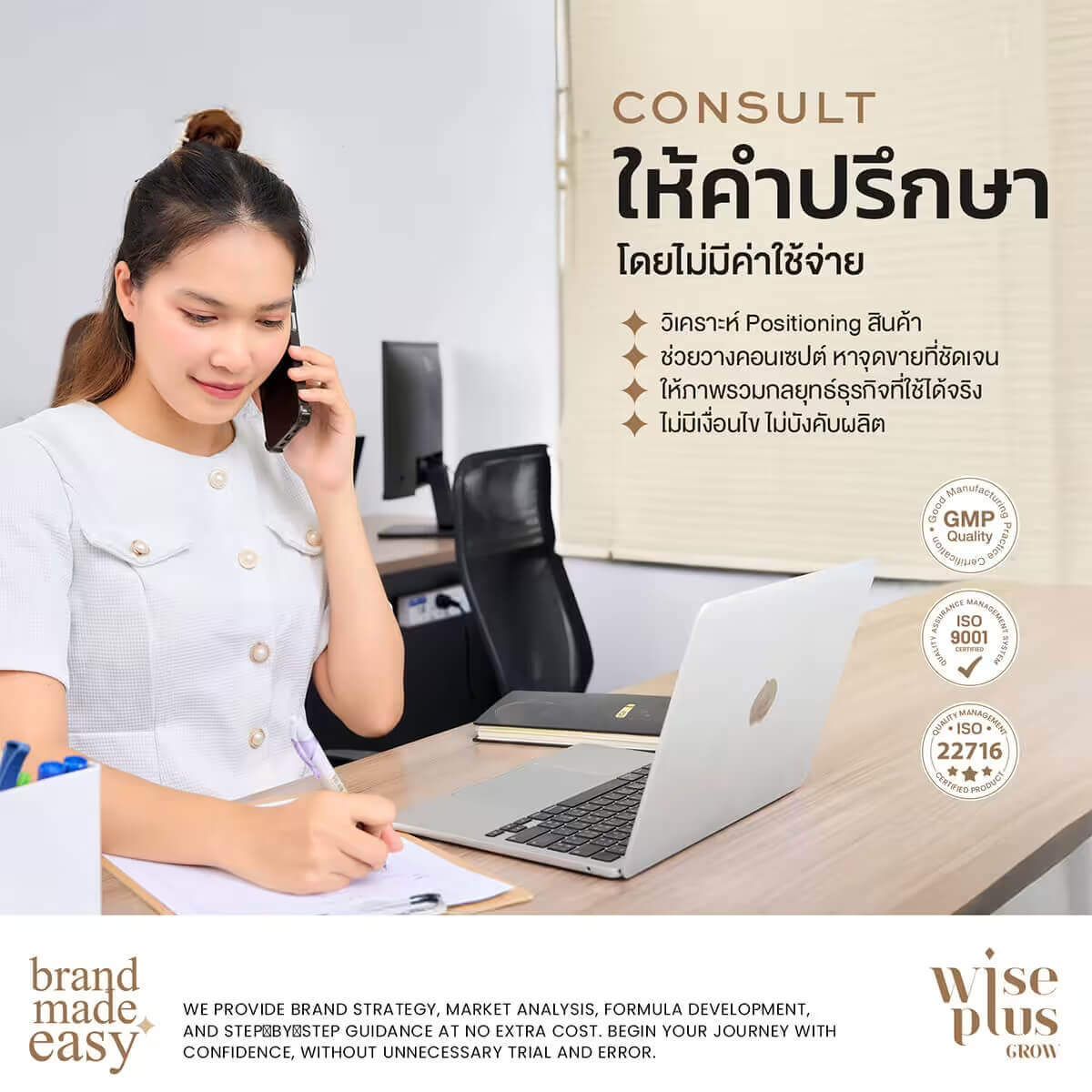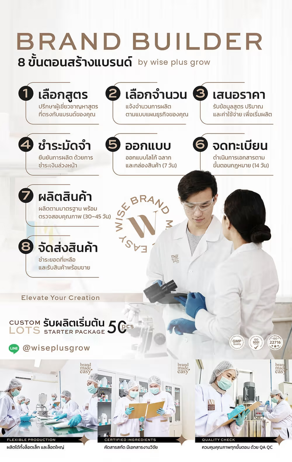 ในด้านการผลิต Wise Plus Grow มีความยืดหยุ่นสูง รองรับการผลิตขั้นต่ำเริ่มต้นเพียง 50 ชิ้น ช่วยให้ผู้ประกอบการสามารถทดสอบตลาด ลดความเสี่ยงด้านเงินลงทุน และขยายกำลังการผลิตได้อย่างเป็นขั้นตอนเมื่อธุรกิจเติบโต ควบคู่กับบริการออกแบบโลโก้ ฉลาก และบรรจุภัณฑ์ โดยทีมดีไซน์ที่เข้าใจทั้งมิติการตลาดและพฤติกรรมผู้บริโภค