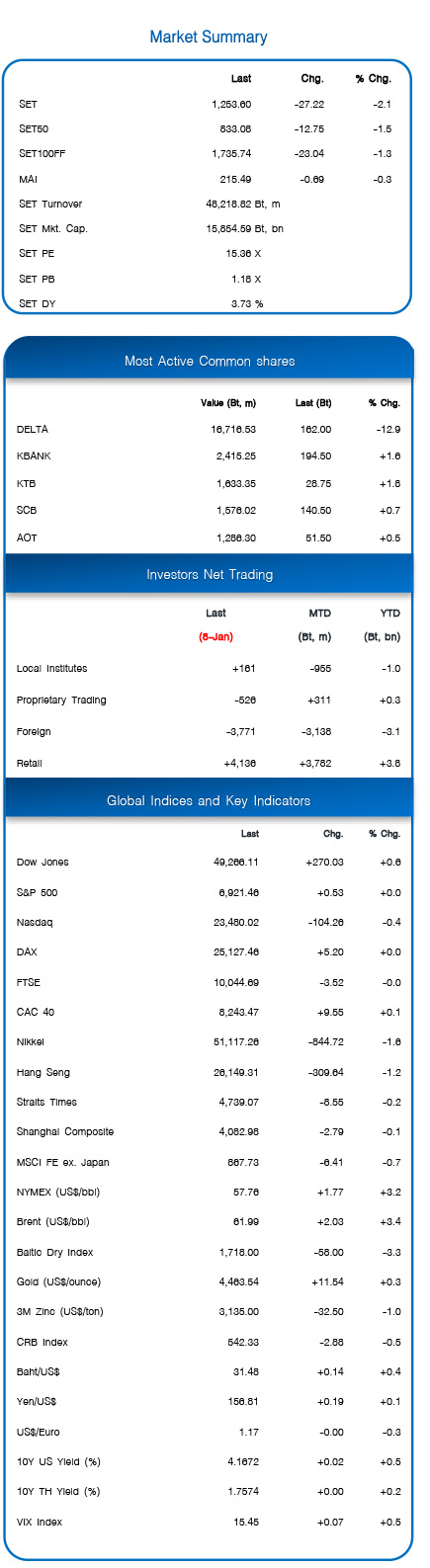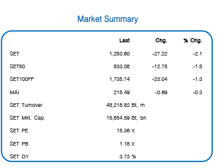 DELTA กดดันหนัก – SET กระโดดลงและแกว่งแดนลบทั้งวันในกรอบ 1251-68 มูลค่าซื้อขายพุ่งแตะ 4.82 หมื่นลบ. SET ถูกกดดันจากหุ้น DELTA ถึง -24 จุด หลังบ.แม่ที่ไต้หวันขาย Big Lot 51.2 ล้านหุ้นที่ราคา 171 บ. มูลค่า 8.75 พันลบ. ต่างชาติพลิกขายสุทธิ 3.77 พันลบ. และ Short S50 Futures 19,657 สัญญา 3 วันติด