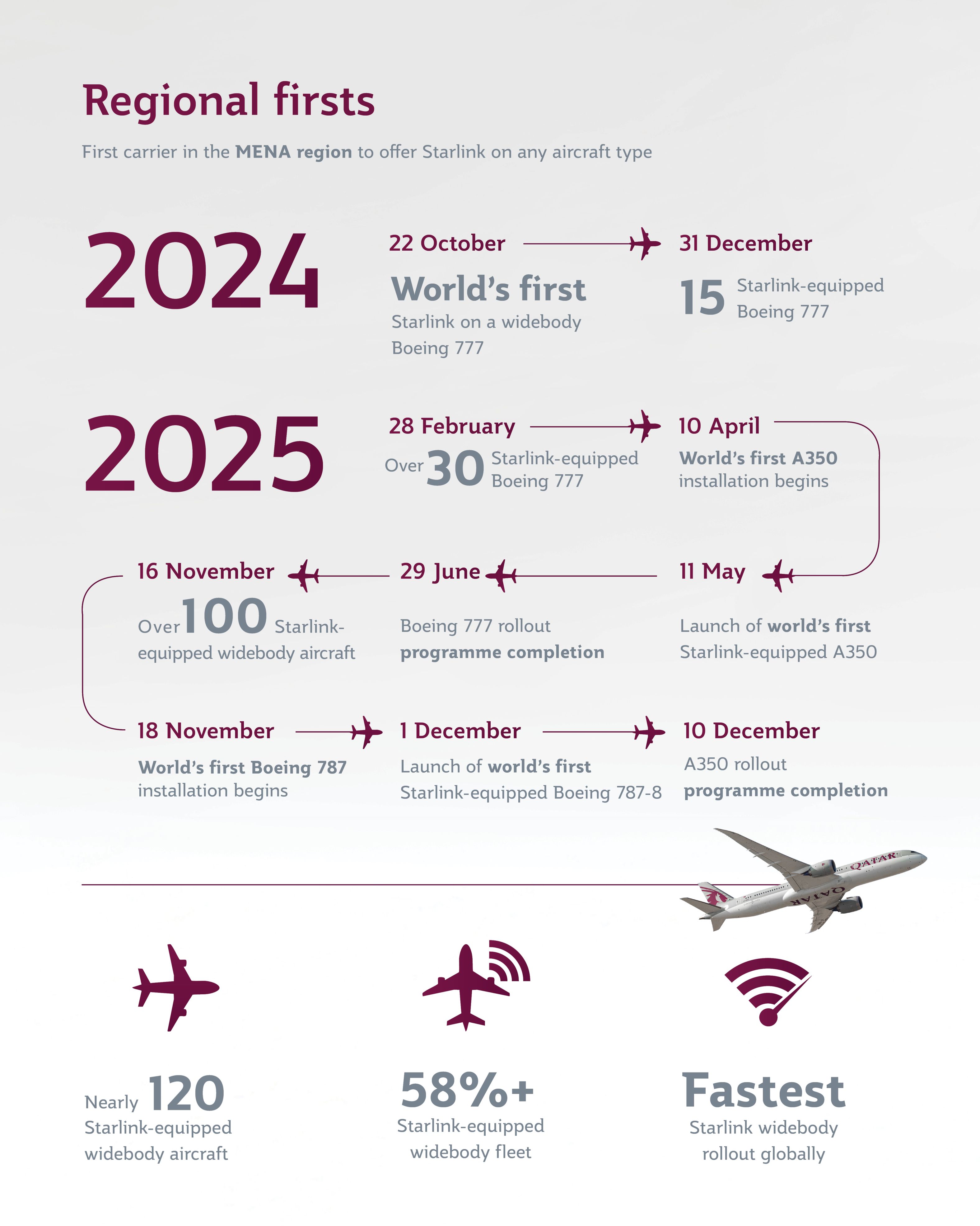 กาตาร์ แอร์เวย์ส ในฐานะผู้ให้บริการอินเทอร์เน็ตความเร็วสูง Starlink บนฝูงบินลำตัวกว้างรายแรกที่ใหญ่ที่สุดของโลก ได้ติดตั้งระบบ Starlink บนเครื่องบินโบอิ้ง 787-8 ครอบคลุมทั่วทั้งฝูงบินแอร์บัส A350 เสร็จสิ้นภายในระยะเวลาเพียง 8 เดือน ในเดือนธันวาคม 2025 ที่ผ่านมา ปัจจุบัน กาตาร์ แอร์เวย์ส ได้ให้บริการอินเทอร์เน็ตที่ความเร็วสูงที่สุดบนเครื่องบินโบอิ้ง 787-8 Dreamliner จำนวน 3 ลำ เสริมทัพฝูงบินลำตัวกว้าง 120 ลำที่มีอินเทอร์เน็ต Starlink