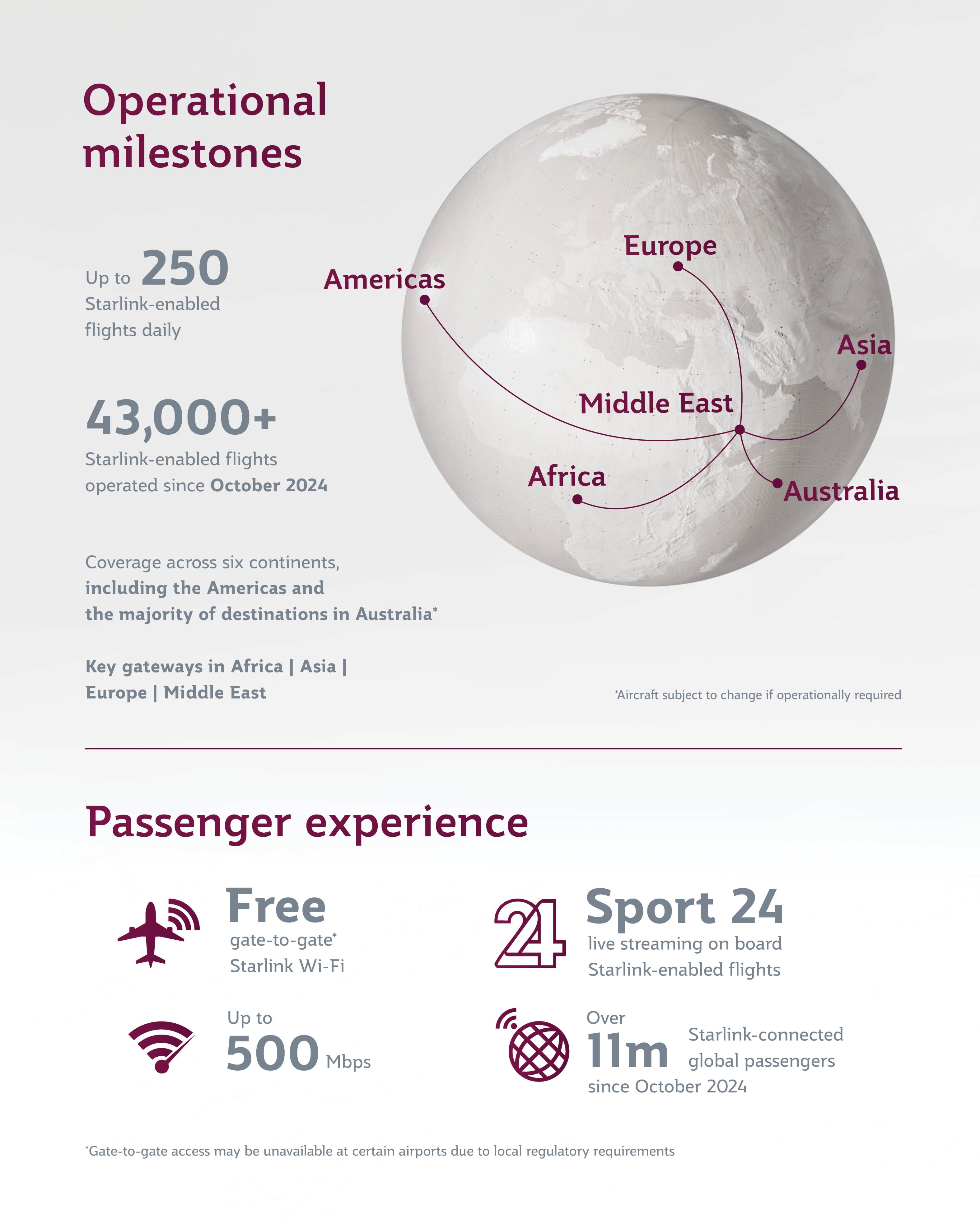 ในปี 2025 Starlink ได้ให้บริการผู้โดยสารมากกว่า 21 ล้านคนบนสายการบินทั่วโลก โดยผู้โดยสารของ กาตาร์ แอร์เวย์ส ที่ใช้งาน Starlink คิดเป็นเกือบครึ่งของจำนวนทั้งหมด หรือมากกว่า 10 ล้านคน ซึ่งถือเป็นสายการบินแรกของโลกที่ให้บริการอินเทอร์เน็ตความเร็วสูงแบบไม่มีค่าใช้จ่ายบนเครื่องบินลำตัวกว้าง สำหรับเที่ยวบินระยะไกลและระยะไกลพิเศษ