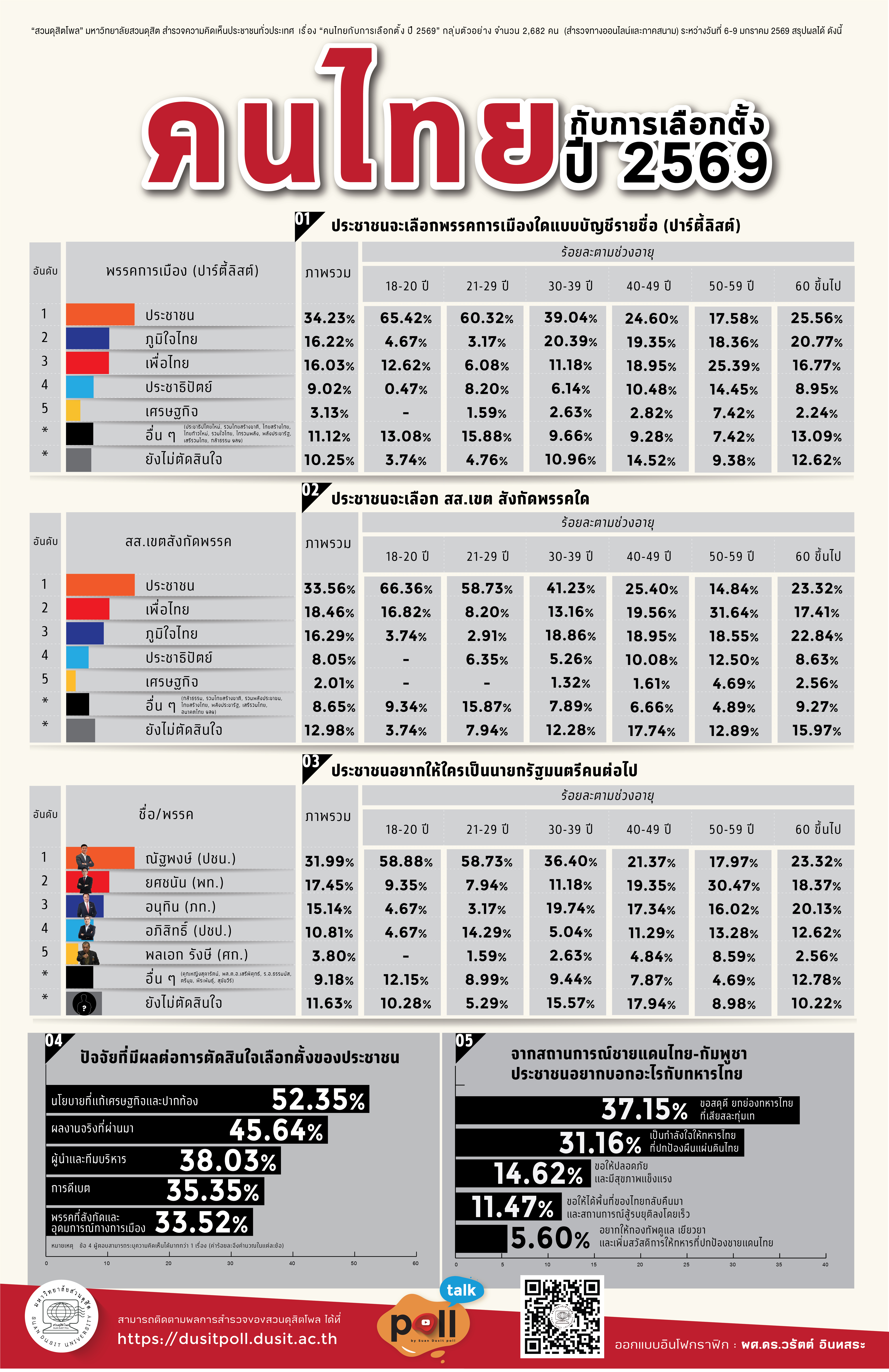 "สวนดุสิตโพล" มหาวิทยาลัยสวนดุสิต สำรวจความคิดเห็นประชาชนทั่วประเทศ เรื่อง "คนไทยกับการเลือกตั้ง ปี 2569" กลุ่มตัวอย่าง จำนวน 2,682 คน (สำรวจทางออนไลน์และภาคสนาม) ระหว่างวันที่ 6-9 มกราคม 2569 สรุปผล ได้ ดังนี้