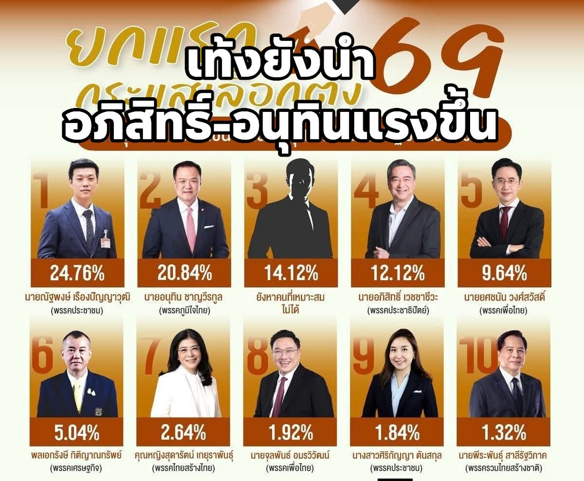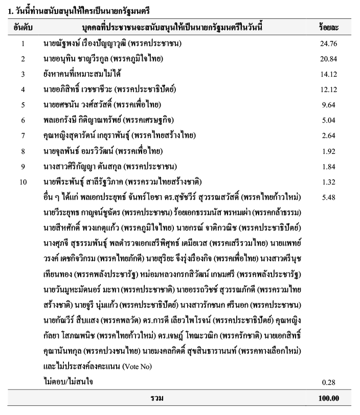 จากการสำรวจเมื่อถามถึงบุคคลที่ประชาชนจะสนับสนุนให้เป็นนายกรัฐมนตรีในวันนี้ พบว่า อันดับ 1 ร้อยละ 24.76 ระบุว่าเป็น นายณัฐพงษ์ เรืองปัญญาวุฒิ (พรรคประชาชน) อันดับ 2 ร้อยละ 20.84 ระบุว่าเป็น นายอนุทิน ชาญวีรกูล (พรรคภูมิใจไทย) อันดับ 3 ร้อยละ 14.12 ระบุว่า ยังหาคนที่เหมาะสมไม่ได้ อันดับ 4 ร้อยละ 12.12 ระบุว่าเป็น นายอภิสิทธิ์ เวชชาชีวะ (พรรคประชาธิปัตย์) อันดับ 5 ร้อยละ 9.64 ระบุว่าเป็น นายยศชนัน วงศ์สวัสดิ์ (พรรคเพื่อไทย) อันดับ 6 ร้อยละ 5.04 ระบุว่าเป็น พลเอกรังษี กิติญาณทรัพย์ (พรรคเศรษฐกิจ) อันดับ 7 ร้อยละ 2.64 ระบุว่าเป็น คุณหญิงสุดารัตน์ เกยุราพันธุ์ (พรรคไทยสร้างไทย) อันดับ 8 ร้อยละ 1.92 ระบุว่าเป็น นายจุลพันธ์ อมรวิวัฒน์ (พรรคเพื่อไทย) อันดับ 9 ร้อยละ 1.84 ระบุว่าเป็น นางสาวศิริกัญญา ตันสกุล (พรรคประชาชน) อันดับ 10 ร้อยละ 1.32 ระบุว่าเป็น นายพีระพันธุ์ สาลีรัฐวิภาค (พรรครวมไทยสร้างชาติ) ร้อยละ 5.48 ระบุอื่น ๆ ได้แก่ พลเอกประยุทธ์ จันทร์โอชา ดร.สุชัชวีร์ สุวรรณสวัสดิ์ (พรรคไทยก้าวใหม่) นายวีระยุทธ กาญจน์ชูฉัตร (พรรคประชาชน) ร้อยเอกธรรมนัส พรหมเผ่า (พรรคกล้าธรรม) นายสีหศักดิ์ พวงเกตุแก้ว (พรรคภูมิใจไทย) นายกรณ์ จาติกวณิช (พรรคประชาธิปัตย์) นางศุภจี สุธรรมพันธุ์ พลตำรวจเอกเสรีพิศุทธ์ เตมียเวส (พรรคเสรีรวมไทย) นายแพทย์วรงค์ เดชกิจวิกรม (พรรคไทยภักดี) นายสุริยะ จึงรุ่งเรืองกิจ (พรรคเพื่อไทย) นางสาวตรีนุช เทียนทอง (พรรคพลังประชารัฐ) หม่อมหลวงกรกสิวัฒน์ เกษมศรี (พรรคพลังประชารัฐ) นายวันมูหะมัดนอร์ มะทา (พรรคประชาชาติ) นายอรรถวิชช์ สุวรรณภักดี (พรรครวมไทยสร้างชาติ) นายจูรี นุ่มแก้ว (พรรคประชาธิปัตย์) นางสาวรักชนก ศรีนอก (พรรคประชาชน) นายกัณวีร์ สืบแสง (พรรคพลวัต) ดร.การดี เลียวไพโรจน์ (พรรคประชาธิปัตย์) คุณหญิงกัลยา โสภณพนิช (พรรคไทยก้าวใหม่) ดร.เจษฎ์ โทณะวณิก (พรรครักชาติ) นายเอกสิทธิ์ คุณานันทกุล (พรรคปวงชนไทย) นายมงคลกิตติ์ สุขสินธารานนท์ (พรรคทางเลือกใหม่) และไม่ประสงค์ลงคะแนน (Vote No) และร้อยละ 0.28 ระบุว่า ไม่ตอบ/ไม่สนใจ
