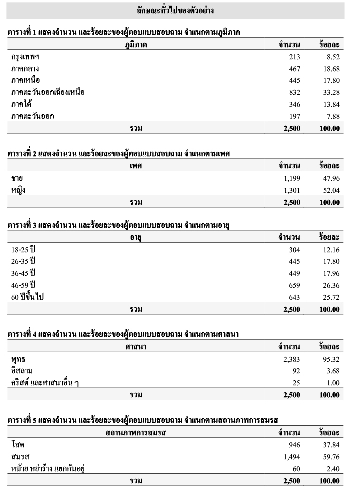เมื่อพิจารณาลักษณะทั่วไปของตัวอย่าง พบว่า ตัวอย่าง ร้อยละ 8.52 มีภูมิลำเนาอยู่กรุงเทพฯ ร้อยละ 18.68 มีภูมิลำเนาอยู่ภาคกลาง ร้อยละ 17.80 มีภูมิลำเนาอยู่ภาคเหนือ ร้อยละ 33.28 มีภูมิลำเนาอยู่ภาคตะวันออกเฉียงเหนือ ร้อยละ 13.84 มีภูมิลำเนาอยู่ภาคใต้ และร้อยละ 7.88 มีภูมิลำเนาอยู่ภาคตะวันออก โดยตัวอย่าง ร้อยละ 47.96 เป็นเพศชาย และร้อยละ 52.04 เป็นเพศหญิง