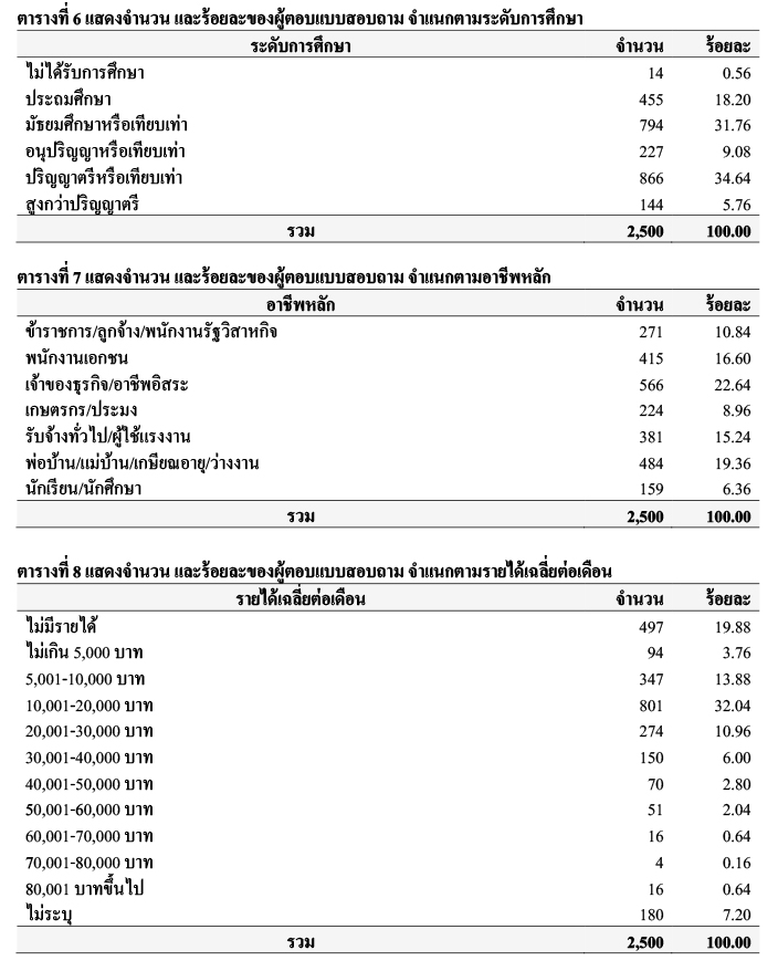 ตัวอย่าง ร้อยละ 10.84 ประกอบอาชีพข้าราชการ/ลูกจ้าง/พนักงานรัฐวิสาหกิจ ร้อยละ 16.60 ประกอบอาชีพพนักงานเอกชน ร้อยละ 22.64 ประกอบอาชีพเจ้าของธุรกิจ/อาชีพอิสระ ร้อยละ 8.96 ประกอบอาชีพเกษตรกร/ประมง ร้อยละ 15.24 ประกอบอาชีพรับจ้างทั่วไป/ผู้ใช้แรงงาน ร้อยละ 19.36 เป็นพ่อบ้าน/แม่บ้าน/เกษียณอายุ/ว่างงาน และร้อยละ 6.36 เป็นนักเรียน/นักศึกษา