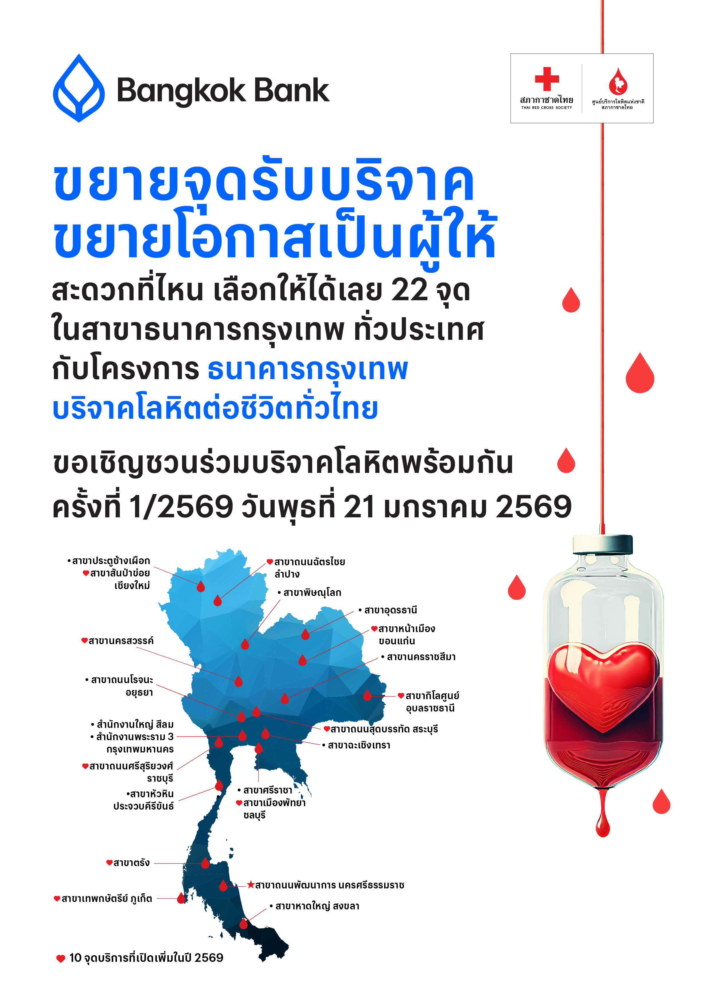 ธนาคารกรุงเทพเดินหน้าเพิ่มจุดรับบริจาคโลหิตเคลื่อนที่อีก 10 จุด ในปี 2569 รวมเป็น 22 จุด ผ่านสาขาธนาคารทุกภูมิภาคทั่วประเทศ ภายใต้โครงการ “ธนาคารกรุงเทพ บริจาคโลหิตต่อชีวิตทั่วไทย” เริ่มเปิดรับบริจาคครั้งแรก ในวันพุธที่ 21 มกราคม 2569 เพิ่มความสะดวก เข้าถึงง่าย สู่การเป็น "ผู้ให้" ทุก 3 เดือน พร้อมส่งมอบพลังแห่งความสำเร็จในปี 2568 ด้วยปริมาณโลหิต 70 แสนซีซี ภายใต้โครงการ “ธนาคารกรุงเทพร่วมส่งมอบ 70 แสนซีซี บริจาคโลหิตต่อชีวิตทั่วไทย” แก่สภากาชาดไทย ตอกย้ำการเป็น “เพื่อนคู่คิด มิตรคู่บ้าน” ที่อยู่เคียงข้างสังคมไทยในทุกมิติ