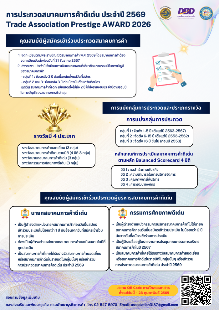 กรมพัฒนาธุรกิจการค้า เชิญชวนสมาคมการค้าทั่วประเทศเข้าร่วมประกวด“สมาคมการค้าดีเด่น” ประจำปี 2569 (Trade Association Prestige AWARD 2026) เพื่อคัดเลือกและเชิดชูเกียรติสมาคมการค้าที่มีการบริหารจัดการองค์กรอย่างมีประสิทธิภาพ มีบทบาทสำคัญในการพัฒนาและขับเคลื่อนธุรกิจไทย ส่งเสริมและยกระดับการบริหารจัดการองค์กรสู่มาตรฐานสากล เปิดรับสมัครตั้งแต่บัดนี้ จนถึง 28 กุมภาพันธ์ 2569 ฟรี!!! ไม่มีค่าใช้จ่าย