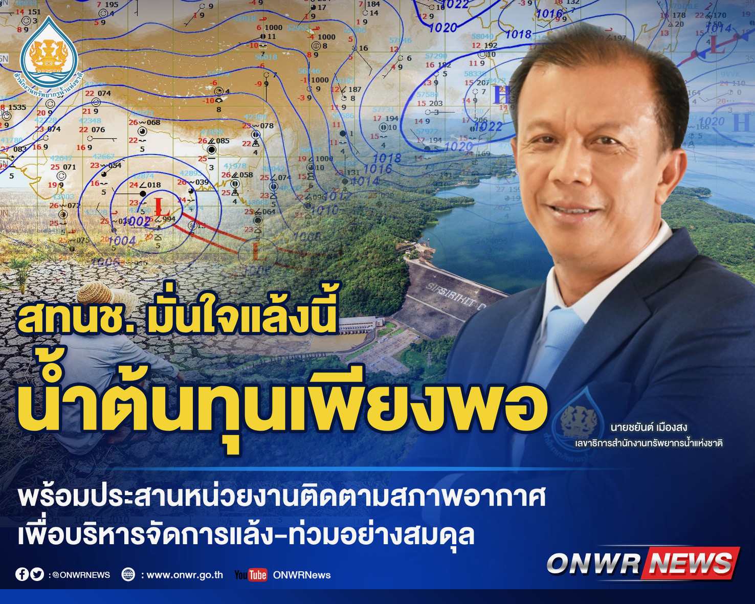 สทนช. เดินหน้าบูรณาการทุกหน่วยงานขับเคลื่อนการบริหารจัดการน้ำแล้ง-น้ำท่วม เผยปีนี้ปริมาณน้ำต้นทุนมีจำนวนมาก จะประสานหน่วยงานเฝ้าติดตามสภาพอากาศอย่างใกล้ชิด พร้อมปรับแผนจัดสรรน้ำให้สอดคล้องกับสถานการณ์ เพื่อให้มีน้ำใช้อย่างเพียงพอและรับมือต่อการเปลี่ยนแปลงสภาพภูมิอากาศ