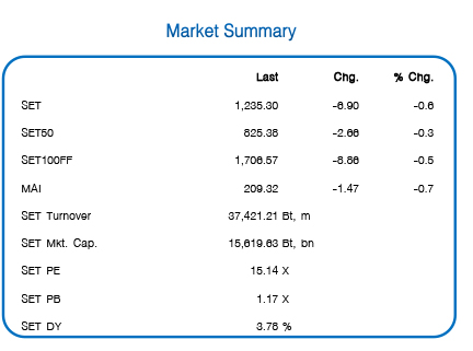 ซึมลง – SET แกว่งอิงแดนลบในกรอบ 1232-51 ร่วง 2 วันติด ยังมีแรงขายลดความเสี่ยงหลัง SET หลุดโซนแนวรับ 1240-50 บ่งชี้สัญญาณเทคนิคเป็นลบมากขึ้น หุ้นรพ., ค้าปลีก, ไฟแนนซ์ และ DELTA ถ่วงตลาด แต่มีแรงซื้อหุ้นพลังงานและสื่อสาร ต่างชาติขายสุทธิ 566 ลบ. 4 วันติด และ Short S50 Futures 10,523 สัญญา 6 วันติด