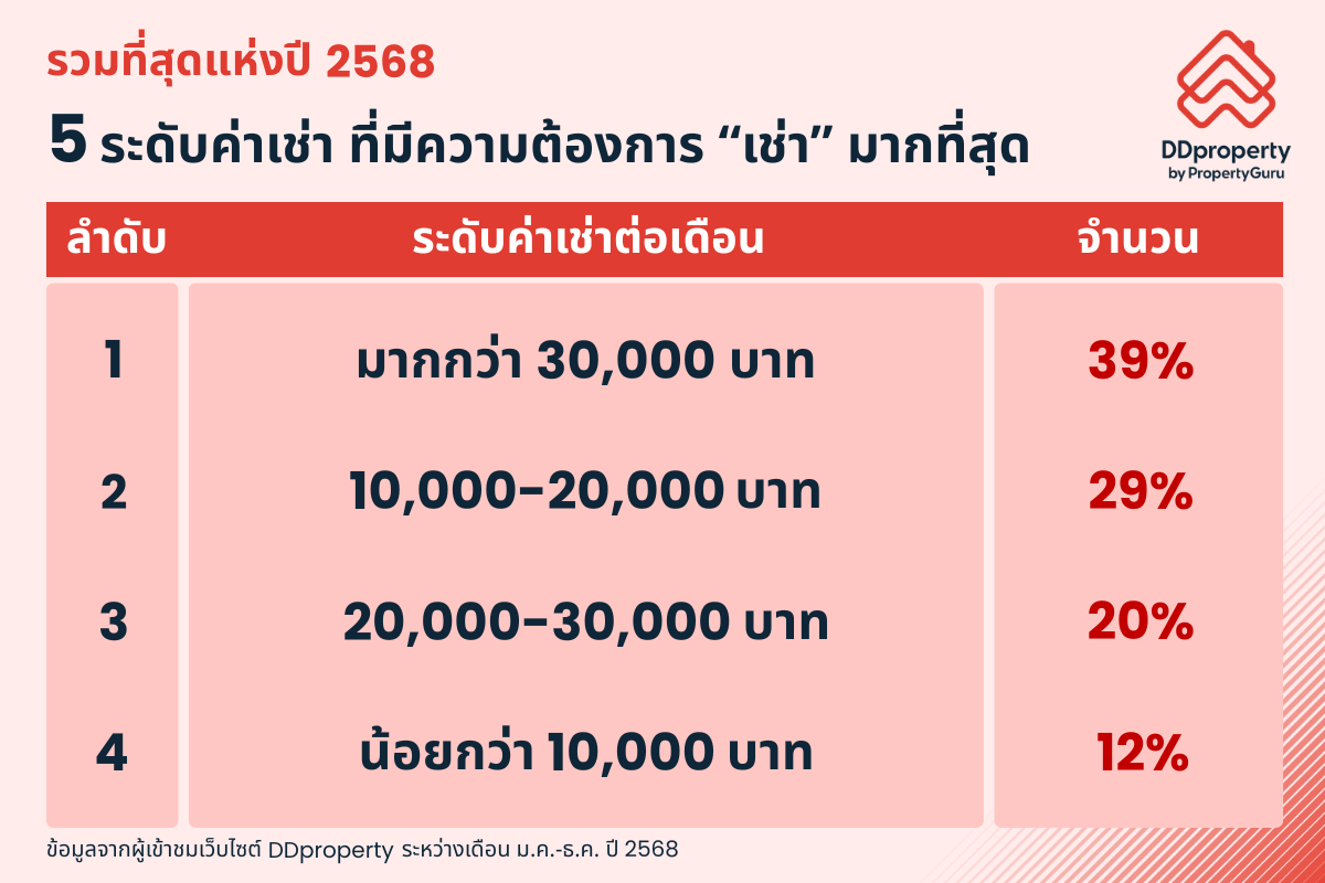 โดยระดับราคาที่อยู่อาศัยที่ชาวไทยมีความต้องการเช่ามากที่สุดในรอบปี 2568 ได้แก่