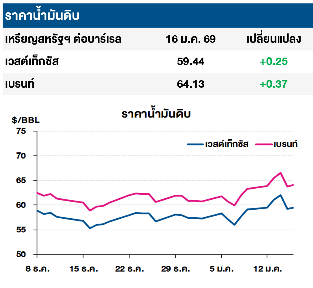 (+) ราคาน้ำมันดิบเวสต์เท็กซัสและเบรนท์ปรับเพิ่มขึ้นเล็กน้อย หลังนักลงทุนบางส่วนปิดสถานะขายชอร์ตก่อนช่วงวันหยุดยาว 3 วัน เนื่องในวันมาร์ติน ลูเธอร์ คิง ของสหรัฐฯ ขณะเดียวกัน ความกังวลด้านภูมิรัฐศาสตร์เกี่ยวกับความเป็นไปได้ที่สหรัฐฯ จะโจมตีอิหร่านยังคงดำเนินอยู่ ภายหลังกองเรือบรรทุกเครื่องบิน ยูเอสเอส อับราฮัม ลินคอล์น มีกำหนดเข้าสู่อ่าวเปอร์เซียในสัปดาห์หน้า ส่งผลให้มีแรงซื้อคืนสะสมก่อนวันหยุด เนื่องจากนักลงทุนไม่ต้องการเสี่ยงถือสถานะขายในช่วงวันหยุดยาว