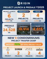 นายพีระพงศ์ จรูญเอก ประธานเจ้าหน้าที่บริหาร บริษัท ออริจิ้น พร็อพเพอร์ตี้ จำกัด (มหาชน) หรือ ORI ผู้พัฒนาธุรกิจอสังหาริมทรัพย์ครบวงจร เปิดเผยถึงผลประกอบการด้านยอดขาย (Presales) จากโครงการที่อยู่อาศัยในปี 2568 รวมทั้งสิ้น 24,528 ล้านบาท โดยแบ่งเป็นยอดขายของกลุ่มคอนโดมิเนียม ภายใต้ บริษัท ออริจิ้น เวอร์ติเคิล คอร์ปอเรชั่น จํากัด หรือ ORIGIN VERTICAL กว่า 19,914 ล้านบาท คิดเป็นสัดส่วน 81% และยอดขายจากโครงการบ้านแนวราบ ภายใต้ บริษัท บริทาเนีย จำกัด (มหาชน) หรือ BRI กว่า 4,615 ล้านบาท เป็นสัดส่วนประมาณ 19% โดยยอดขายดังกล่าวมาจากกลุ่มโครงการพร้อมอยู่ (Ready to move) ประมาณ 14,483 ล้านบาท และยอดขายจากกลุ่มโครงการที่เปิดขายใหม่ (New Launch) และอยู่ระหว่างดำเนินการก่อสร้าง (Ongoing) รวมกันประมาณ 10,045 ล้านบาท