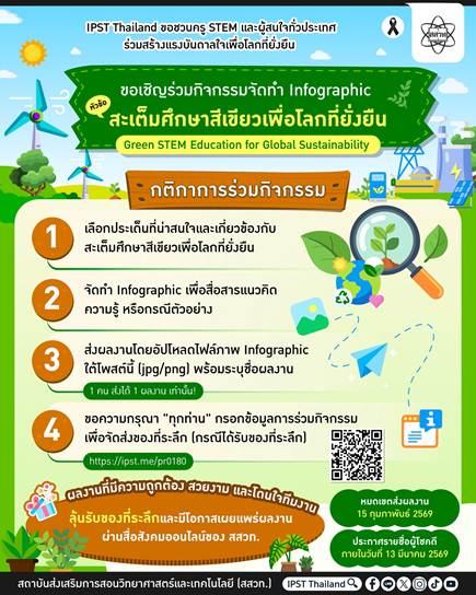 สถาบันส่งเสริมการสอนวิทยาศาสตร์และเทคโนโลยี (สสวท.) โดยเฟสบุ๊ก IPST Thailand ขอเชิญครู STEM บุคลากรทางการศึกษา และผู้สนใจทั่วประเทศ ร่วมกิจกรรมจัดทำ Infographic ภายใต้หัวข้อ “สะเต็มศึกษาสีเขียวเพื่อโลกที่ยั่งยืน (Green STEM Education for Global Sustainability)” เพื่อถ่ายทอดแนวคิด ความรู้และนวัตกรรมด้านวิทยาศาสตร์ คณิตศาสตร์ และเทคโนโลยี ที่เชื่อมโยงกับการพัฒนาที่ยั่งยืน ผ่านผลงานที่สวยงาม เข้าใจง่าย และจุดประกายการเรียนรู้ทั้งในและนอกห้องเรียน โดยเปิดรับผลงานถึงวันที่ 15 กุมภาพันธ์ 2569 ผลงานที่โดดเด่นมีโอกาสได้รับของที่ระลึกและเผยแพร่ผ่านสื่อสังคมออนไลน์ของ สสวท. ประกาศรายชื่อผู้ได้รับคัดเลือกภายในวันที่ 13 มีนาคม 2569 ร่วมเป็นส่วนหนึ่งในการสร้างพลังการเรียนรู้ STEM เพื่อโลกที่ยั่งยืนไปด้วยกัน ดูรายละเอียดและส่งผลงานได้ที่
