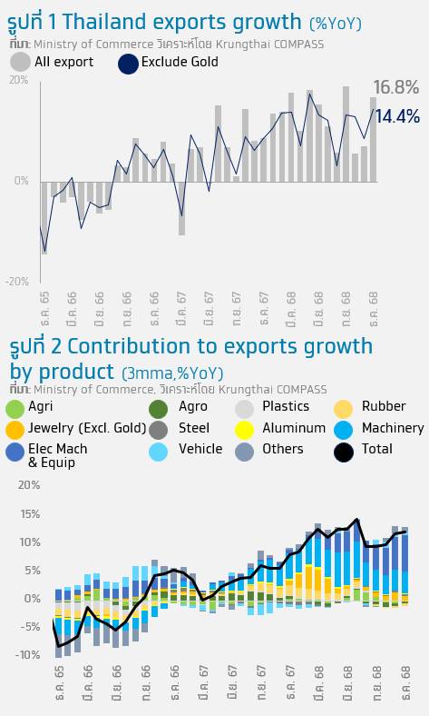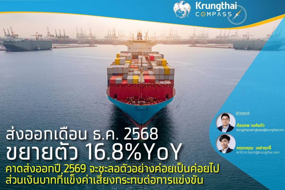 มูลค่าส่งออกเดือน ธ.ค. 2568 ขยายตัว 16.8%YoY ทั้งนี้ ทั้งปีการส่งออกไทยขยายตัว 12.9%YoY