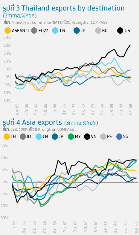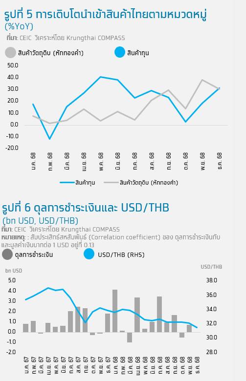 • Krungthai COMPASS มองการส่งออกปี 2569 จะหดตัวลงจากปี 2568 จากการปรับขึ้นภาษีนำเข้าสหรัฐฯ ที่จะส่งผลเต็มปี และผลของฐานสูง แต่คาดว่าการส่งออกจะลดลงอย่างค่อยเป็นค่อยไป โดยมูลค่าส่งออกรวมหักทองคำและสินค้าอิเล็กทรอนิกส์ในช่วง ส.ค.-ธ.ค. 68 (หลังสหรัฐเริ่มเก็บภาษี) ขยายตัว 3.2%YoY ชะลอลงอย่างค่อยเป็นค่อยไปจากช่วง ม.ค.-ก.ค. 68 ที่ขยายตัวสูง 8.1%YoY นอกจากนี้ การนำเข้าที่เกี่ยวกับการส่งออกยังเติบโตสูง (รูปที่ 5) โดยการนำเข้าสินค้าทุนขยายตัวสูงถึง 31.7% ขณะที่การนำเข้าวัตถุดิบหักทองคำขยายตัวสูงถึง 30.5% สะท้อนว่าการส่งออกสินค้า Low Local Content จะชะลอตัวลงไม่มากนักในช่วงต้นปี 2569 ในระยะข้างหน้า ต้องติดตาม