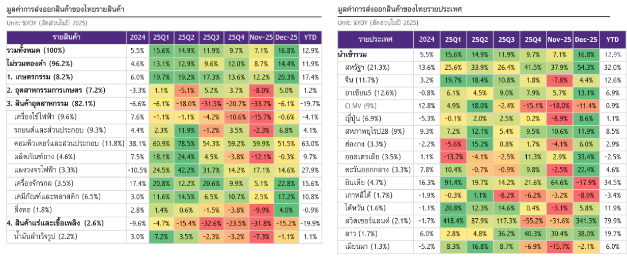1) การส่งออกไทยไปสหรัฐฯ ยังขยายตัวสูง 54.3%YOY ในเดือน ธ.ค. 2025 แม้หลายสินค้าโดนกำแพงภาษีสูงขึ้นแล้ว ส่งออกไปสหรัฐฯ ส่งท้ายปี 2025 เร่งตัวต่อเนื่องเทียบเดือน พ.ย. (37.9%YOY) หากไม่รวมสินค้าอิเล็กทรอนิกส์ (ยังได้รับการยกเว้นกำแพงภาษีจากสหรัฐฯ) ส่งออกสินค้ากลุ่มนี้ไปตลาดสหรัฐฯ ขยายตัวได้สูง 21.7% เช่นเดียวกัน สะท้อนความต้องการสินค้าไทยในตลาดสหรัฐฯ ที่มีสูง