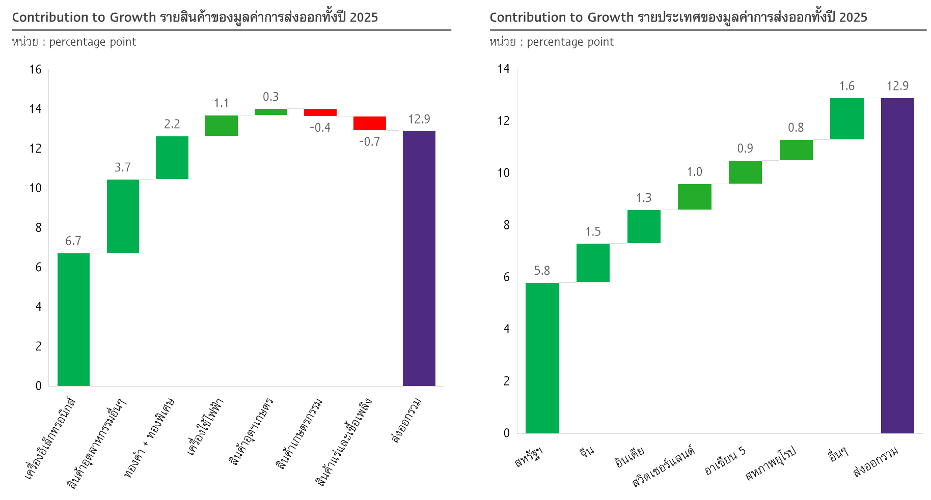 แม้เผชิญกำแพงภาษี สินค้าส่งออกหลักของไทยไปสหรัฐฯ 13 จาก 15 รายการขยายตัวดี โดยเฉพาะสินค้าอิเล็กทรอนิกส์และเครื่องใช้ไฟฟ้า เช่น เครื่องคอมพิวเตอร์ อุปกรณ์และส่วนประกอบ, เครื่องโทรสาร โทรศัพท์ อุปกรณ์และส่วนประกอบ, หม้อแปลงไฟฟ้าและส่วนประกอบ, เครื่องจักรกลและส่วนประกอบของเครื่องจักรกล และเครื่องปรับอากาศและส่วนประกอบ ขยายตัวสูง 123%, 117.3%, 86.6%, 48.4% และ 46.5% ตามลำดับ การส่งออกไปสหรัฐฯ มีส่วนช่วยให้การส่งออกไทยเดือนนี้ขยายตัว (CTG) 10.2% มากกว่าครึ่งของการเติบโตของส่งออกรวม 16.8%