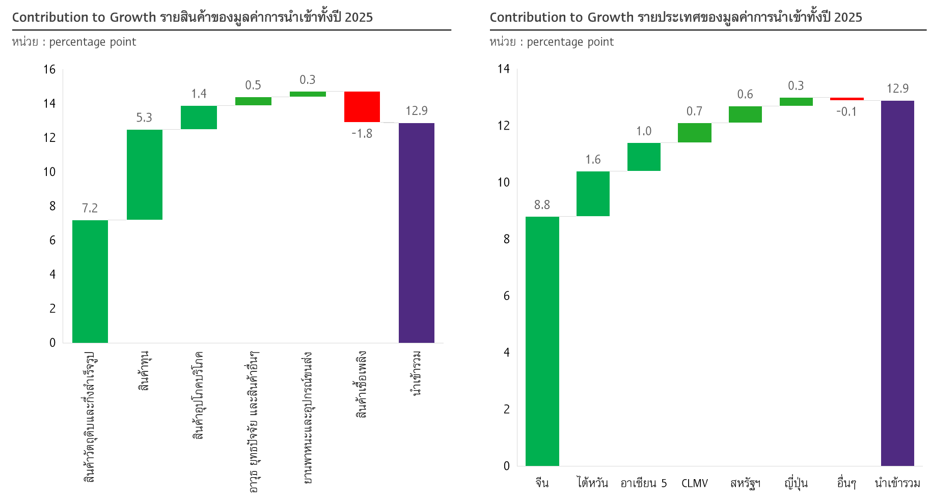 • สินค้าทุน (CTG : 5.3%) ส่วนใหญ่เป็นการนำเข้าเครื่องจักรไฟฟ้าและส่วนประกอบ, เครื่องจักรกลและส่วนประกอบ และเครื่องคอมพิวเตอร์ อุปกรณ์และส่วนประกอบ ขยายตัวกว่า 47.1%, 16.2% และ 4.1% ตามลำดับ สอดคล้องกับข้อมูลการลงทุนอุตสาหกรรมอิเล็กทรอนิกส์ และ Data center ที่ขยายตัวต่อเนื่องในไทย เป็นปัจจัยสำคัญที่หนุนให้การนำเข้าสินค้าทุนกลุ่มนี้ขยายตัวสูงเป็นพิเศษในปี 2025