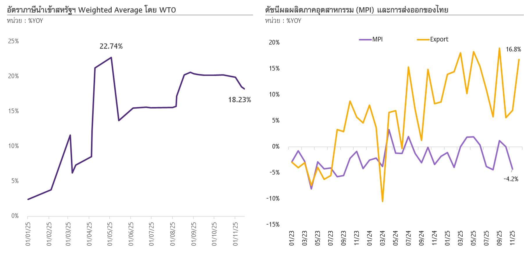 รูปที่ 6 : อัตราภาษีนำเข้าสหรัฐฯ เฉลี่ยลดลงจากช่วงต้นปี 2025 ส่งผลให้การค้าโลกและไทยเติบโตดีกว่าคาด แต่ภาคการผลิตไทยอาจได้มูลค่าเพิ่มจำกัดจากการส่งออกที่เร่งสูง