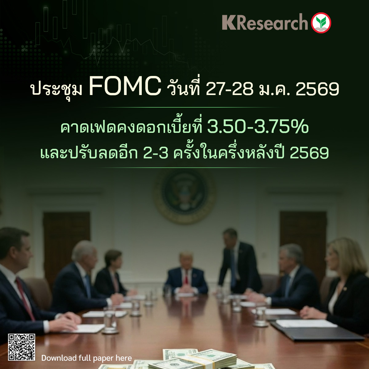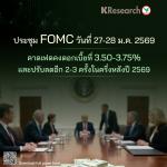 ในการประชุม FOMC วันที่ 27-28 ม.ค. 2569 คาดเฟดมีมติคงดอกเบี้ยที่ 3.50-3.75% จากเศรษฐกิจสหรัฐฯ ที่ยังมีความยืดหยุ่น (Resilient) และเงินเฟ้อที่ไม่เร่งตัวแม้ยังอยู่สูงกว่าเป้าหมาย ขณะเดียวกันเฟดคงต้องการรอติดตามพัฒนาการของเศรษฐกิจและเงินเฟ้ออย่างใกล้ชิด ท่ามกลางความไม่แน่นอนในระยะข้างหน้าที่ยังอยู่ในระดับสูง โดยมีรายละเอียดดังนี้