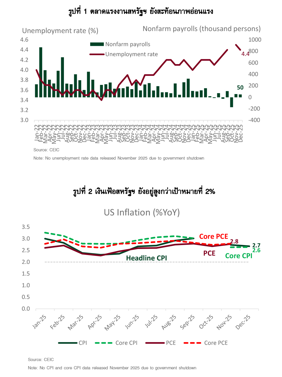 • เงินเฟ้อยังสูงกว่าเป้าหมาย 2% แต่ความเสี่ยงขาขึ้นจำกัด โดยเงินเฟ้อทั่วไป (CPI) เดือนธ.ค. 2568 อยู่ที่ 2.7%YoY และเงินเฟ้อพื้นฐาน (Core CPI) อยู่ที่ 2.6%YoY ทรงตัวจากเดือนก่อนหน้าและเป็นไปตามตลาดคาด ขณะที่เงินเฟ้อฟื้นฐานวัดจากรายจ่ายเพื่อการบริโภคส่วนบุคคล (Core PCE) ที่เฟดให้ความสำคัญเป็นพิเศษ ขยับขึ้นเล็กน้อยมาอยู่ที่ 2.8%YoY ในเดือนพ.ย. 2568 สะท้อนแรงกดดันด้านราคาโดยเฉพาะในภาคบริการที่ยังคงอยู่ แต่ยังไม่ถึงขั้นสร้างความกังวลต่อเสถียรภาพเงินเฟ้อในระยะกลาง โดยเฉพาะในบริบทที่อุปสงค์ภายในประเทศและตลาดแรงงานเริ่มชะลอลง