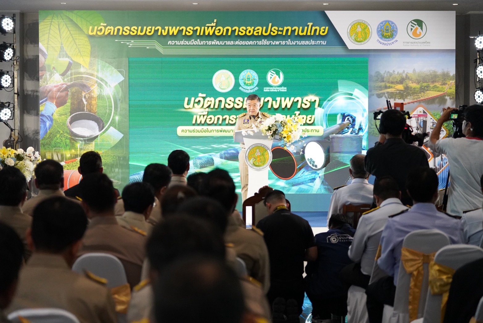 การยางแห่งประเทศไทย (กยท.) ร่วมกับกรมชลประทาน แถลงข่าวและนำเสนอ "นวัตกรรมยางพาราเพื่อการชลประทานไทย" ภายใต้ความร่วมมือในการพัฒนาและต่อยอดการใช้ยางพาราในงานชลประทาน โดยได้รับเกียรติจาก นายวิณะโรจน์ ทรัพย์ส่งสุข ปลัดกระทรวงเกษตรและสหกรณ์ ให้เกียรติเป็นประธานเปิดงานพร้อมด้วย นายสุริยพล นุชอนงค์ อธิบดีกรมชลประทาน ดร.เพิก เลิศวังพง รักษาการแทนผู้ว่าการการยางแห่งประเทศไทย ตลอดจนผู้บริหารระดับสูงจากหน่วยงานต่างๆ เข้าร่วมงานอย่างคับคั่ง เดินหน้าผลักดัน “นวัตกรรมยางพาราเพื่อการชลประทานไทย” เสนอผลงานนวัตกรรมทุ่นยางพาราดักผักตบชวา RID-UNITED และท่อHDPEผสมยางพาราสำหรับส่งและระบายน้ำ ซึ่งเป็นนวัตกรรมที่นำไปใช้งานจริงในพื้นที่ชลประทาน ผ่านความร่วมมือด้านการพัฒนาและต่อยอดการใช้ยางธรรมชาติในงานชลประทาน ให้เกิดการใช้งานจริงอย่างเป็นรูปธรรม มุ่งสร้างมูลค่าเพิ่มให้ผลผลิตยางพาราของประเทศ