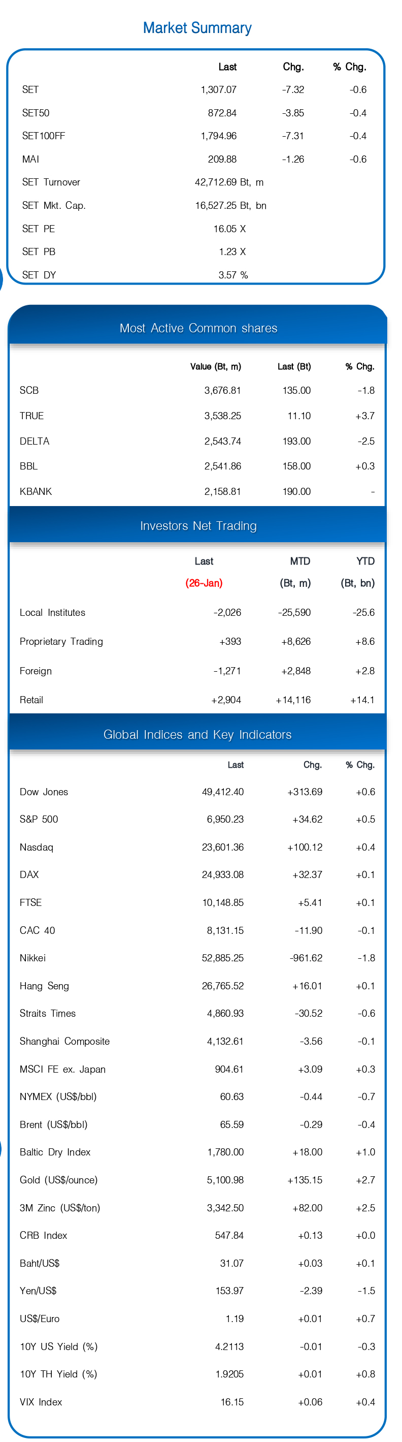 ปรับขึ้น – หุ้นยุโรปขึ้นจากกลุ่มธนาคารก่อนการประกาศงบของธนาคารขนาดใหญ่หลายแห่งในสัปดาห์นี้ ขณะที่หุ้นสหรัฐฯ ขึ้นจากแรงซื้อหุ้นในกลุ่ม Magnificent-7 ก่อนจะทยอยประกาศงบในสัปดาห์นี้ อาทิ Tesla, Microsoft, Meta Platforms และ Apple ด้านราคาน้ำมันดิบ WTI อ่อนลงหลังพุ่งแรงวันก่อน นลท.จับตาผลกระทบจากพายุฤดูหนาวที่กำลังซัดเข้าสหรัฐฯ