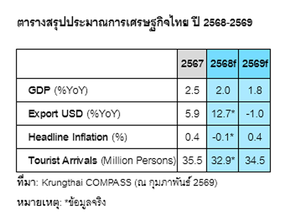 ดร.พชรพจน์ นันทรามาศ ผู้ช่วยกรรมการผู้จัดการใหญ่ และ Chief Economist ธนาคารกรุงไทย เปิดเผยว่า Krungthai COMPASS ประเมินเศรษฐกิจไทยในปี 2569 จะขยายตัวที่ 1.8% ชะลอจากปีก่อนหน้า โดยจะเป็นครั้งแรกในรอบ 30 ปีที่จีดีพีโตต่ำกว่า 2.0% หากไม่รวมช่วงวิกฤต โดยภาคการส่งออกของไทยมีแนวโน้มหดตัวลง จากความเสี่ยง Geopolitics ขณะที่การท่องเที่ยวฟื้นตัวช้าจากการสูญเสียตลาดกลุ่มนักท่องเที่ยวเอเชีย