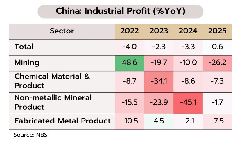 จีน: กำไรภาคอุตสาหกรรมในปี 2568 พลิกกลับมาขยายตัวเป็นครั้งแรกในรอบ 4 ปีที่ 0.6% YoY โดยได้แรงหนุนจากกลุ่มอิเล็กทรอนิกส์ และการถลุงและแปรรูปโลหะที่ไม่ใช่เหล็ก ซึ่งขยายตัวสูง รวมถึงเครื่องจักรและอุปกรณ์ไฟฟ้า และยานยนต์ ที่สามารถพลิกกลับมาเป็นบวก อย่างไรก็ตาม อุตสาหกรรมเกินกว่ากึ่งหนึ่งยังคงเผชิญกับกำไรที่หดตัว ความหวังสำคัญจึงอยู่ที่มาตรการควบคุมการแข่งขันทางด้านราคา และการบรรเทาปัญหาอุปทานส่วนเกิน ซึ่งต้องอาศัยเวลา และอาจสร้างแรงกดดันต่อภาคอุตสาหกรรมในระยะสั้น