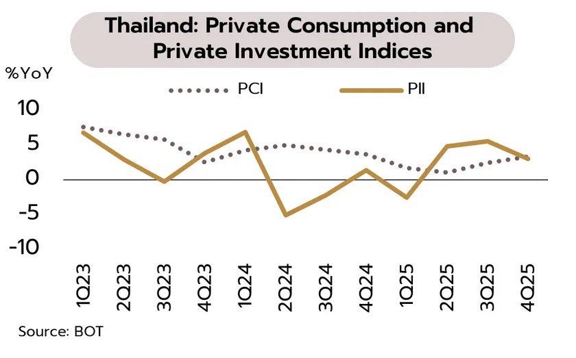 ไทย: เศรษฐกิจไทยฟื้นในไตรมาสสุดท้ายของปี 2568 แต่มีแนวโน้มชะลอลงในปีนี้ ธนาคารแห่งประเทศไทย (ธปท.) รายงานเครื่องชี้เศรษฐกิจในไตรมาส 4 ปี 2568 ภาพรวมอุปสงค์ทั้งในและต่างประเทศปรับดีขึ้นจากไตรมาสก่อน โดยการส่งออกสินค้าและรายรับภาคการท่องเที่ยวเพิ่มขึ้น ขณะเดียวกันการบริโภคภาคเอกชนได้แรงหนุนจากมาตรการกระตุ้นเศรษฐกิจ และการลงทุนภาคเอกชนขยายตัวในหมวดเครื่องจักรและอุปกรณ์
