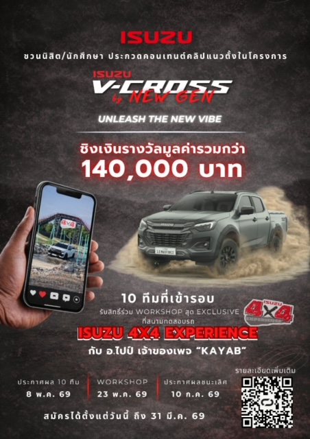 อีซูซุชวนน้อง ๆ นิสิต นักศึกษา นำเสนอไอเดียสุดครีเอทีฟผ่านการแข่งขันการทำคลิปวิดีโอแนวตั้ง ความยาวไม่เกิน 2 นาที ผ่านโครงการ Isuzu V-Cross by New Gen 2026 ภายใต้หัวข้อรอบคัดเลือก "ถ้า ISUZU V-CROSS เป็นคน จะเป็นคนแบบไหน" ผู้สนใจสามารถสมัครเข้าร่วมการแข่งขัน ได้ทั้งในรูปแบบรายบุคคล หรือแบบทีม ทีมละไม่เกิน 5 คน โดยไม่จำกัดสถาบัน คณะ หรือชั้นปีการศึกษา พิเศษสำหรับผู้เข้ารอบ 10 ทีมสุดท้าย จะได้ร่วมสัมผัสสมรรถนะปิกอัพสปอร์ตออฟโรด ISUZU V-CROSS 4x4 “THE ONE & ONLY” พร้อมเรียนรู้เทคนิคการทำคอนเทนต์แบบมืออาชีพกับคุณฤกษ์อรุณ เจียมสวัสดิ์ เจ้าของเพจ “Kayab” เพื่อเพิ่มประสบการณ์ด้านการสร้างสรรค์คอนเทนต์ให้แก่ทีมที่ผ่านเข้ารอบ ก่อนเข้าสู่การแข่งขันรอบชิงชนะเลิศ ณ สนามทดสอบรถ Isuzu 4x4 Experience จังหวัดปทุมธานี ชิงเงินรางวัลรวมมูลค่ากว่า 140,000 บาท