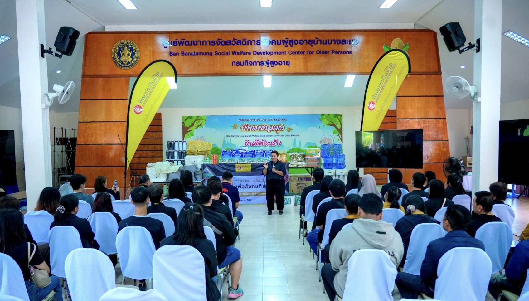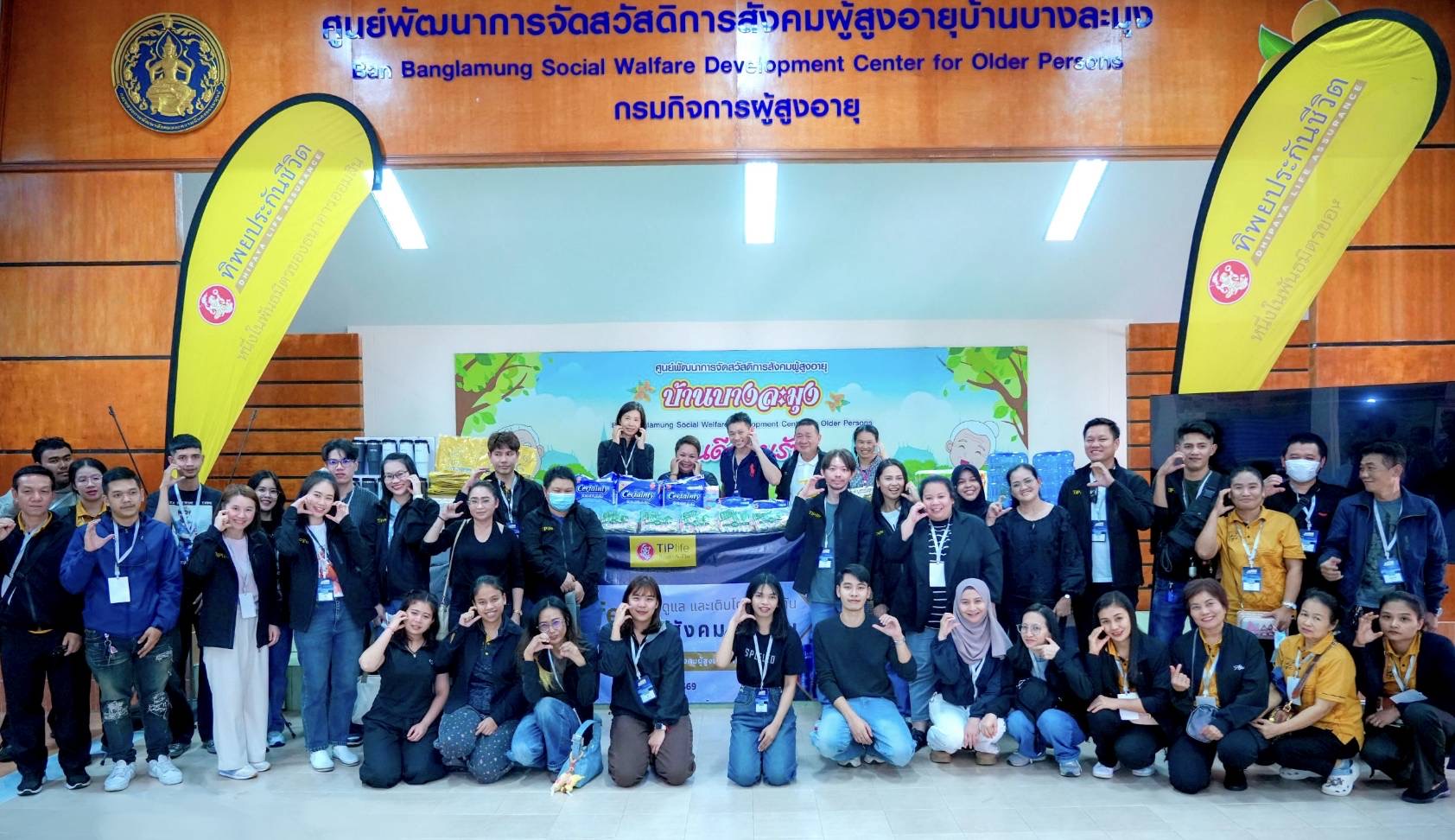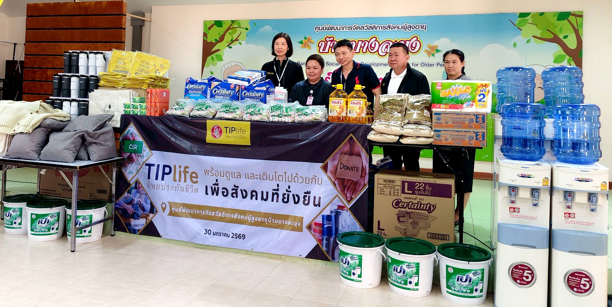 บริษัท ทิพยประกันชีวิต จำกัด (มหาชน) นำโดยคุณพุทธรักษ์ ทิพชัชวาลวงศ์ ผู้ช่วยประธานเจ้าหน้าที่บริหารสายงานคณิตศาสตร์ประกันภัย (ตรงกลาง) พร้อมคณะผู้บริหารและพนักงาน ร่วมส่งความสุขแบ่งปันรอยยิ้ม มอบสิ่งของเครื่องใช้ที่จำเป็นต่อการใช้ชีวิตของผู้สูงอายุ ให้แก่คุณอรอุมา อินทฉาย ผู้อำนวยการศูนย์พัฒนาการจัดสวัสดิการสังคมผู้สูงอายุบ้านบางละมุง เพื่อสนับสนุนและส่งเสริมการดูแลผู้สูงอายุในความของศูนย์ฯ และในพื้นที่ความรับผิดชอบ ณ ศูนย์พัฒนาการจัดสวัสดิการสังคมผู้สูงอายุบ้านบางละมุง จังหวัดชลบุรี