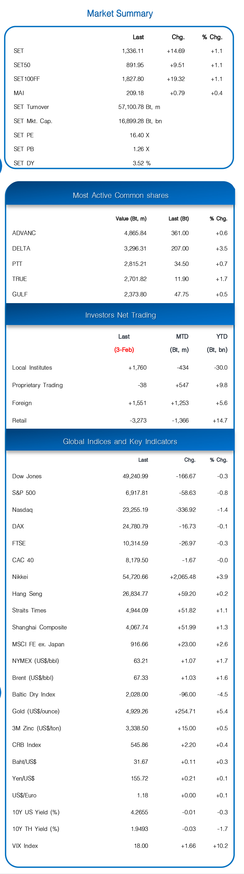 ส่วนใหญ่อ่อนตัวลง – จากแรงขายทำกำไรหลังตลาดวันก่อนขึ้นแตะสูงสุดใหม่ ท่ามกลางความกังวลการแข่งขันเกี่ยวกับ AI ที่ดุเดือด และนลท.ระมัดระวังการซื้อขายก่อนการเปิดเผยผลประกอบการของเทคยักษ์ใหญ่อย่าง Alphabet และ Amazon ในสัปดาห์นี้ ด้านราคาน้ำมันดิบ WTI รีบาวด์ +1.7% หลังสหรัฐฯ ยิงโดรนของอิหร่านที่เข้ามาใกล้เรือรบของสหรัฐฯ