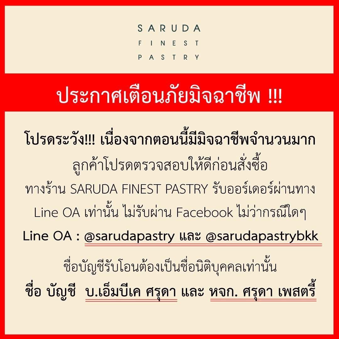 ทาง SARUDA FINEST PASTRY ขอชี้แจงว่า ร้านไม่มีส่วนเกี่ยวข้องใด ๆ กับ Facebook Page ปลอมดังกล่าว และขอความร่วมมือลูกค้าทุกท่านหลีกเลี่ยงการติดต่อ การทำธุรกรรม หรือการคลิกลิงก์โฆษณาใด ๆ ที่เผยแพร่ผ่านเพจปลอมดังกล่าวโดยเด็ดขาด