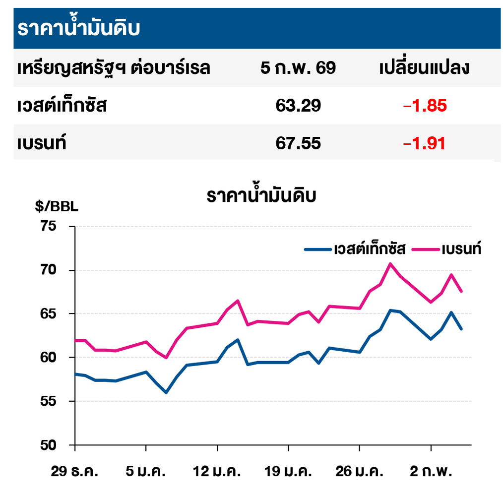 (+/-) สำนักข่าวบลูมเบิร์ก (Bloomberg) เผยตัวเลขมูลค่าการส่งออกน้ำมันของรัสเซียในเดือน ม.ค. 69 ปรับลดลงราว 50 % เมื่อเทียบกับช่วงเดียวกันของปีก่อนหน้า สู่ระดับ 3.7 พันล้านเหรียญสหรัฐฯ ซึ่งถือเป็นระดับที่ต่ำที่สุดในรอบกว่า 5 ปี โดยมูลค่าการส่งออกที่ปรับลดลงได้รับผลกระทบจากราคาขายน้ำมันดิบซึ่งปรับลดลง ทั้งนี้คาดว่าการปรับลดลงของมูลค่าการส่งออกนี้จะกดดันงบประมาณในการทำสงครามของรัสเซีย ขณะที่ล่าสุด สำนักข่าว Reuters เผยว่าการประชุมไตรภาคี (Trilateral meeting) ระหว่างสหรัฐฯ รัสเซียและยูเครน ที่สหรัฐอาหรับเอมิเรตส์ มีทิศทางเชิงบวก หลังรัสเซียและยูเครนบรรลุข้อตกลงแลกเปลี่ยนเชลยศึกจำนวน 314 คนเป็นครั้งแรกในรอบ 5 เดือน