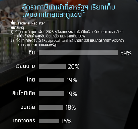 กุ้งแปรรูป: เดิมราคากุ้งแปรรูปของไทยอยู่ลำดับสุดท้ายของกลุ่ม (แพงที่สุด) แต่หลังการเพิ่มภาษีนำเข้าของสหรัฐฯ ราคาของไทยขยับอันดับจากอันดับ 6 ขึ้นมาเป็นอันดับ 5 จากการที่อินเดียตกลงมาเป็นลำดับสุดท้ายของกลุ่ม อีกทั้งราคาส่วนต่างระหว่างไทยกับประเทศที่มีราคาถูกที่สุดในกลุ่มหลังการเพิ่มภาษีนั้นลดลง 24%
