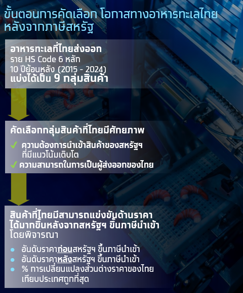 Krungthai COMPASS ประเมินโอกาสของผู้ประกอบการไทยในการส่งออกอาหารทะเลไทย ไปยังสหรัฐฯ โดยพิจารณา 9 กลุ่มสินค้าอาหารทะเลที่ไทยมีการส่งออกในช่วง 10 ปีที่ผ่านมา (2015-2024) พบว่า อาหารทะเลไทย 2 กลุ่ม ได้แก่ ปลาทูน่ากระป๋องและกุ้งแปรรูป เป็นกลุ่มที่มีศักยภาพ โดยทำการพิจารณาจาก 3 ปัจจัย ได้แก่
