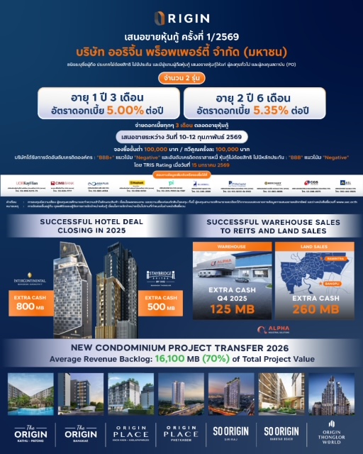 ออริจิ้น เดินหน้าสร้างรายได้ต่อเนื่อง ล่าสุดขายคลังสินค้าเข้ากอง REIT แบรนด์ แอลฟา (ALPHA) คว้า Extra Cash 125 ล้านบาทตามแผน พร้อมจำหน่ายทรัพย์สินที่ดินพร้อมพัฒนา 2 แปลง รับ Extra Cash 260 ล้านบาท อีกทั้งในปี 2569 นี้ มี Backlog คอนโดฯ 7 โครงการที่พร้อมโอนให้ลูกค้า มูลค่ากว่า 16,000 ล้านบาท ช่วยลดความเสี่ยงจากความผันผวนของธุรกิจ พร้อมเสนอขายหุ้นกู้ครั้งที่ 1/2569 ระหว่าง 10-12 กุมภาพันธ์ นี้ จำนวน 2 ชุด ชุดที่ 1 หุ้นกู้อายุ 1 ปี 3 เดือน อัตราดอกเบี้ย 5.00% และ ชุดที่ 2 หุ้นกู้อายุ 2 ปี 6 เดือน อัตราดอกเบี้ย 5.35% จ่ายดอกเบี้ยทุก 3 เดือน
