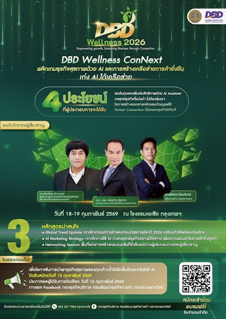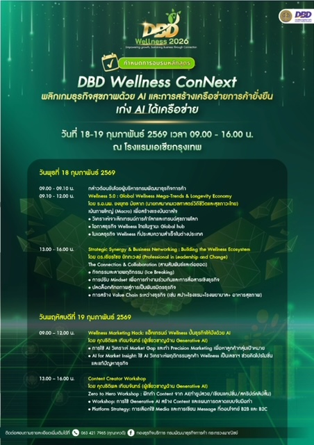 1) Learn & Hack หลักสูตร “DBD Wellness ConNext” ที่ออกแบบมาเพื่อตอบโจทย์การค้ายุคใหม่ที่เน้นการผสมผสานระหว่างเทคโนโลยี AI การบริหารจัดการและการสร้างเครือข่ายธุรกิจ เพื่อยกระดับธุรกิจไทยสู่การเป็น Global Wellness Hub ซึ่งจะจัดขึ้นระหว่างวันที่ 18 -19 กุมภาพันธ์ 2569 ณ โรงแรมเอเชียกรุงเทพฯ โดยกรมฯ ได้เชิญวิทยากรผู้เชี่ยวชาญด้านธุรกิจสุขภาพและ AI มาร่วมให้ความรู้ อาทิ ร.อ.นพ.ยงยุทธ มัยลาภ ในหัวข้อ “Wellness 5.0 : Global Wellness Mega-Trend & Longevity Economy” วิเคราะห์เทรนด์การค้าโลกและโมเดลธุรกิจที่ประสบความสำเร็จในต่างประเทศ เพื่อสร้างแรงบันดาลใจและชี้เป้าโอกาสใหม่ๆ ก่อนคู่แข่ง ต่อด้วย ดร.เธียรไชย ยักทะวงษ์ กับการสร้างระบบนิเวศทางธุรกิจในหัวข้อ “Strategic Synergy & Business Networking” ที่จะช่วยปลดล็อกพลังแห่งความร่วมมือ สร้าง Value Chain ที่แข็งแกร่งระหว่างธุรกิจ เช่น การจับมือกันระหว่าง สปา-โรงแรม-โรงพยาบาล ให้เติบโตไปด้วยกัน และ คุณธิติพล เทียมจันทร์ ในหัวข้อ “Wellness Marketing Hack” แนะนำวิธีการใช้ AI เป็นผู้ช่วยอัจฉริยะ ในการวิเคราะห์ช่องว่างการตลาด เจาะลึกพฤติกรรมลูกค้า และทำ Precision Marketing ได้อย่างแม่นยำ พร้อม Workshop ฝึกทำ Content เริ่มตั้งแต่การใช้ AI สร้างรูปภาพ เขียนแคปชั่น ไปจนถึงปั้นสคริปต์คลิปสั้น ให้ธุรกิจของคุณโดดเด่นและเข้าถึงกลุ่มลูกค้าได้ทันที