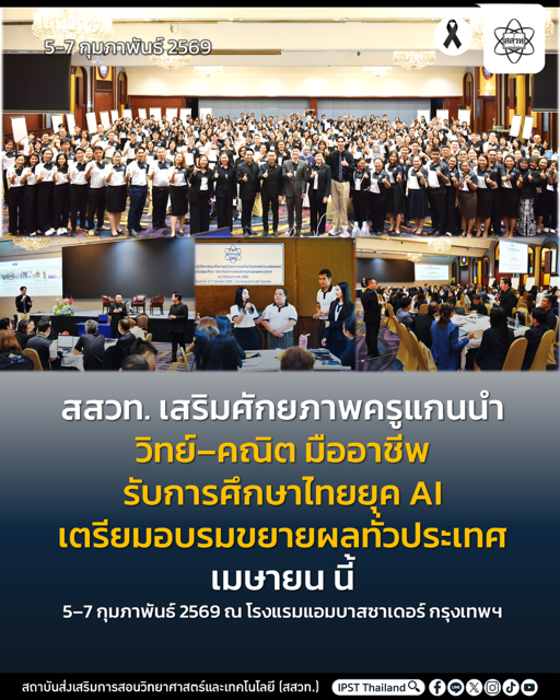 รองศาสตราจารย์ ดร.ธีระเดช เจียรสุขสกุล ผู้อำนวยการสถาบันส่งเสริมการสอนวิทยาศาสตร์และเทคโนโลยี (สสวท.) เป็นประธานเปิดการอบรมเชิงปฏิบัติการพัฒนาศักยภาพครูวิทยากรแกนนำวิชาวิทยาศาสตร์และคณิตศาสตร์ ระดับมัธยมศึกษา และเตรียมความพร้อมการอบรมขยายผลในภูมิภาค ประจำปี 2569 และบรรยายพิเศษในหัวข้อ "สสวท. กับการขับเคลื่อนการศึกษา SMT ในยุคปัญญาประดิษฐ์" โดยการอบรมจัดขึ้นระหว่างวันที่ 5 - 7 กุมภาพันธ์ 2569 ณ โรงแรมแอมบาสซาเดอร์ กรุงเทพฯ โดยมีครูวิทยากรแกนนำ และครูเครือข่ายโครงการส่งเสริมการผลิตครูที่มีความสามารถพิเศษทางวิทยาศาสตร์และคณิตศาสตร์ (สควค.) ร่วมอบรม จำนวน 200 คน