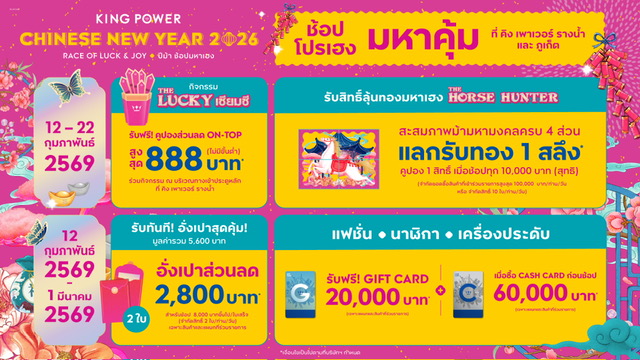 คิง เพาเวอร์ ต้อนรับเทศกาลตรุษจีนปีม้าไฟ จัดแคมเปญ "KING POWER CHINESE NEW YEAR 2026 RACE OF LUCK & JOY ปีม้า ช้อปมหาเฮง" มอบความเฮง 2 ต่อ ให้สมาชิก POWER PASS หากยังไม่เป็นสมาชิกสมัครฟรี! พร้อมรับส่วนลดและสิทธิพิเศษอื่นๆ อีกมากมาย ช้อปโปรเฮงมหาคุ้มตลอด 11 วันเต็ม ตั้งแต่วันที่ 12 – 22 กุมภาพันธ์ 2569