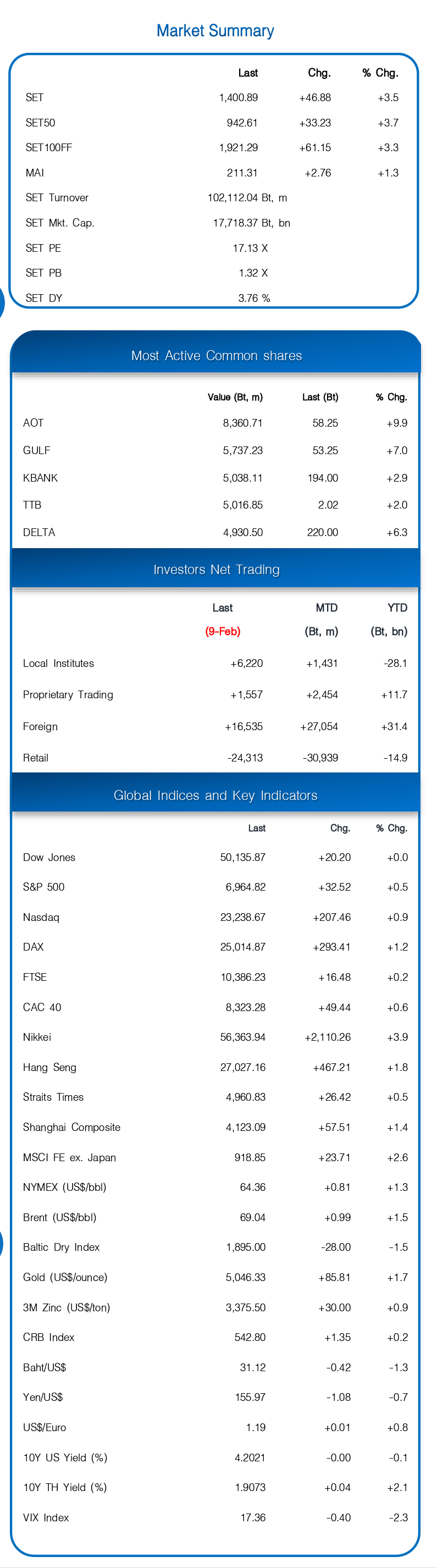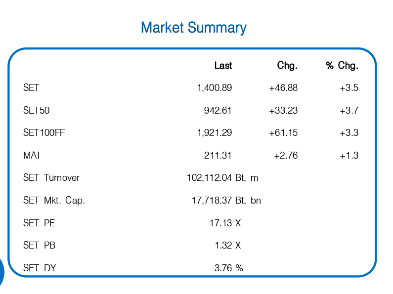 ปิด 1400 วอลุ่มแสนลบ. – SET เปิดกระโดดและแกว่งขึ้นปิด 1400 ครั้งแรกในรอบ 13 เดือน ซื้อขายสูงถึง 1.02 แสนลบ. ขานรับพรรคภูมิใจไทยพลิกชนะเลือกตั้งแบบถล่มทลาย คาดรัฐบาลจะมีเสถียรภาพสูงและคาดหวังความต่อเนื่องนโยบายฯ ต่างชาติซื้อสุทธิ 1.65 หมื่นลบ. 5 วันติด แต่พลิก Short S50 Futures 23,302 สัญญา