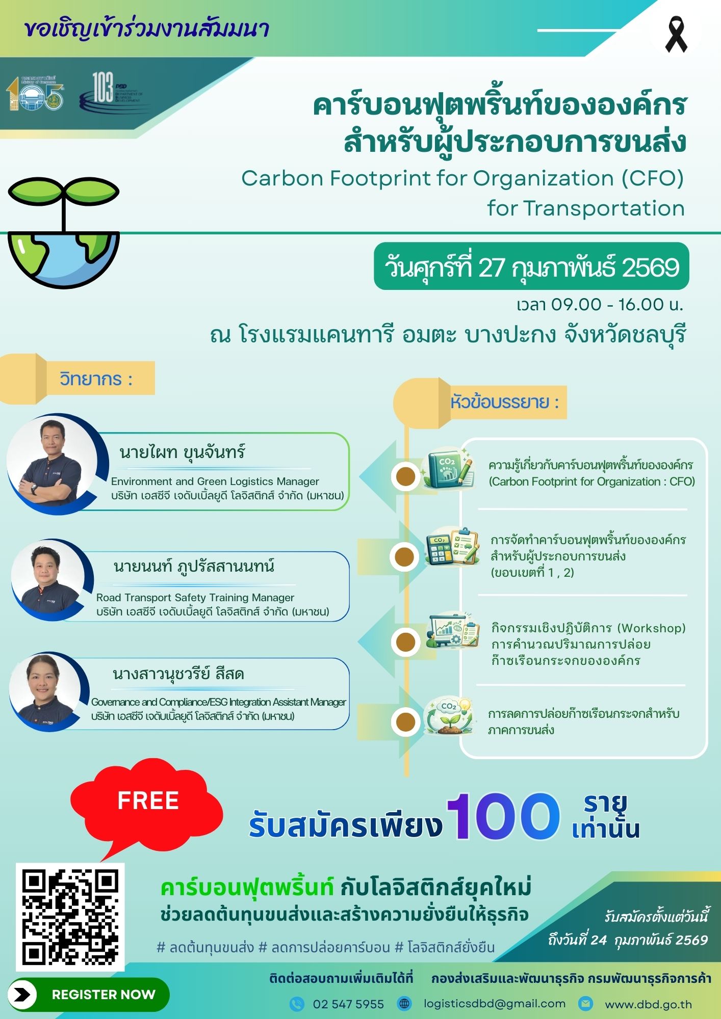 กรมพัฒนาธุรกิจการค้า เตรียมเปิดหลักสูตร “คาร์บอนฟุตพริ้นท์ขององค์กร สำหรับผู้ประกอบการขนส่ง Carbon Footprint for Organization (CFO) for Transportation” ภายใต้แนวคิด "คาร์บอนฟุตพริ้นท์กับโลจิสติกส์ยุคใหม่" ปรับกลยุทธ์ธุรกิจ พร้อมเสริมสร้างองค์ความรู้ พัฒนาทักษะให้ผู้ประกอบการขนส่งและโลจิสติกส์สามารถนำแนวคิดการจัดการคาร์บอนฟุตพริ้นท์ไปประยุกต์ใช้ในการดำเนินธุรกิจได้อย่างเป็นรูปธรรม โดยผู้ประกอบการโลจิสติกส์สามารถสมัครเข้าร่วมสัมมนาได้ตั้งแต่บัดนี้ - 24 กุมภาพันธ์ 2569