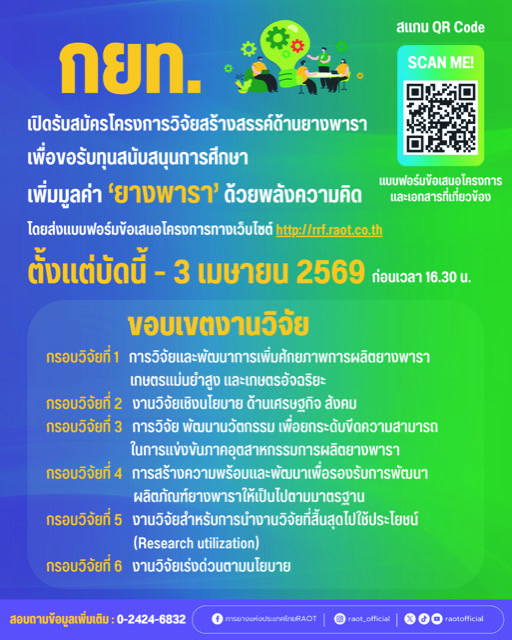 ผู้ที่ประสงค์จะยื่นขอเสนอโครงการวิจัย สามารถดาวน์โหลดแบบฟอร์มของ กยท. และเอกสาร รายละเอียด หลักเกณฑ์ คุณสมบัติ และเอกสารที่เกี่ยวข้องได้ที่ QR Code ตามที่ประกาศกำหนด หรือผ่านทางเว็บไซต์ www.raot.co.th พร้อมจัดทำข้อเสนอโครงการวิจัยฉบับสมบูรณ์ (Full Proposal) และส่งผ่านระบบบริหารงานวิจัยและนวัตกรรมของ กยท. ทางเว็บไซต์ https://rrf.raot.co.th/ ตั้งแต่วันที่ 2 กุมภาพันธ์ 2569 ถึงวันที่ 3 เมษายน 2569 ก่อนเวลา 16.30 น. เท่านั้น หากพ้นระยะเวลาที่ กยท. กำหนด ขอสงวนสิทธิ์ไม่รับพิจารณา และสอบถามรายละเอียดเพิ่มเติมได้ที่ กองบริหารงานวิจัย สถาบันวิจัยยาง โทร. 0-2424-6832