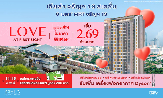 แกรนด์ ยูนิตี้ ต้อนรับเทศกาลวาเลนไทน์ ด้วยโปรโมชั่นสุดพิเศษ "LOVE AT FIRST SIGHT" กับยูนิตคัดพิเศษจาก โครงการ เซียล่า จรัญฯ 13 สเตชั่น (CIELA Charan 13 Station) คอนโดมิเนียมพร้อมอยู่ 0 เมตร ติด MRT สถานีจรัญฯ 13 พร้อมพบกับดีลสุดคุ้มที่จะทำให้คุณตกหลุมรักตั้งแต่แรกเห็น ในราคาเริ่มต้นเพียง 2.69 ล้านบาท* เฉพาะ 14 - 15 กุมภาพันธ์นี้ เท่านั้น