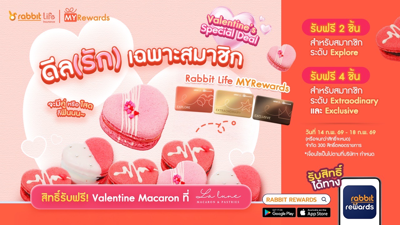 บริษัท แรบบิท ประกันชีวิต จำกัด (มหาชน) หรือ Rabbit Life บริษัทในเครือบริษัท บีทีเอส กรุ๊ป โฮลดิ้งส์ จำกัด (มหาชน) เติมโมเมนต์หวานต้อนรับเทศกาลวาเลนไทน์ ชวนลูกค้าสมาชิก Rabbit Life MYRewards ทุกระดับร่วมเอ็นจอยความสุขในช่วงเทศกาลแห่งความรัก ด้วยของขวัญสุดเอ็กซ์คลูซีฟแทนคำขอบคุณ กับมาการองรูปหัวใจ Collection Valentine “Hearts in Blooms” จาก La Lune Macaron (เฉพาะสาขาที่ร่วมรายการ) ให้ทุกสถานะได้ลิ้มรสความหวานอย่างมีสไตล์ อาทิ