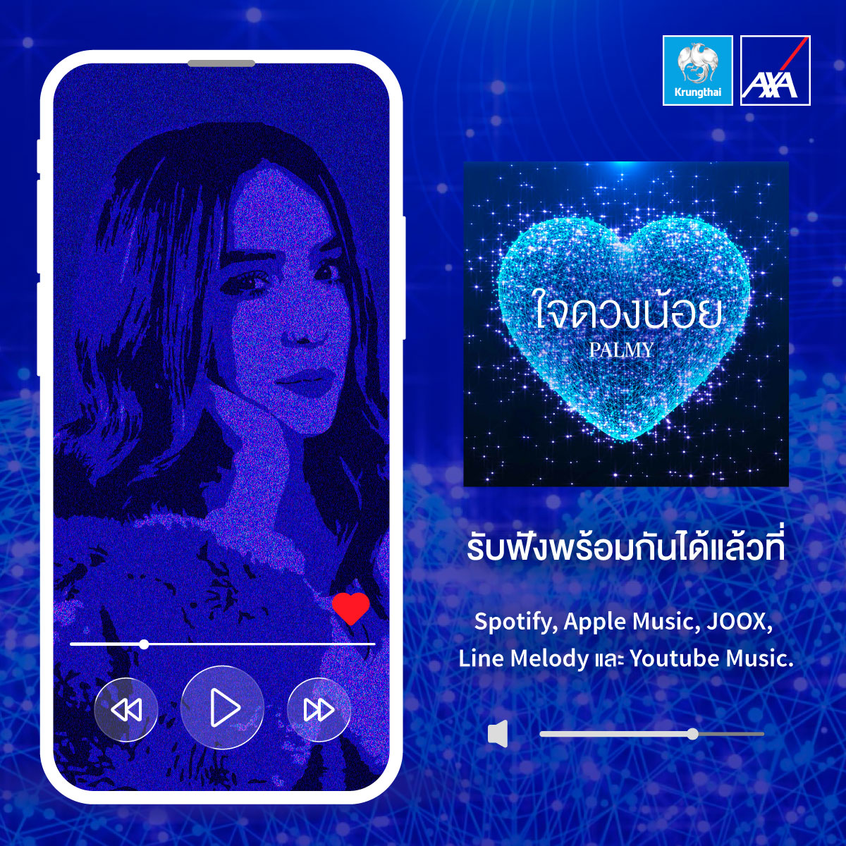 บมจ.กรุงไทย-แอกซ่า ประกันชีวิต โดยคุณบุปผาวดี โอวรารินท์ ประธานเจ้าหน้าที่บริหารฝ่ายการตลาด เปิดตัวเพลงแรกของบริษัทฯ "ใจดวงน้อย" ซึ่งถ่ายทอดเสียงเพลงโดย คุณปาล์มมี่-อีฟ ปานเจริญ ในวันวาเลนไทน์ ผ่านแนวเพลง Synth-Pop ที่ทันสมัย เข้าถึงง่าย แต่เปี่ยมด้วยความหมายที่อบอุ่น เพื่อสื่อสารถึงความมุ่งมั่นของบริษัทฯ ที่เป็นเพื่อนคู่คิด และเคียงข้างลูกค้าในทุกช่วงชีวิต ตลอดจนขอบคุณทุกความไว้วางใจที่ไม่มีวันเปลี่ยนแปลง สอดคล้องเป้าหมายสูงสุดของบริษัทฯ ที่พร้อมอยู่เคียงข้างทุกความเชื่อมั่น ดูแลกันตลอดไป