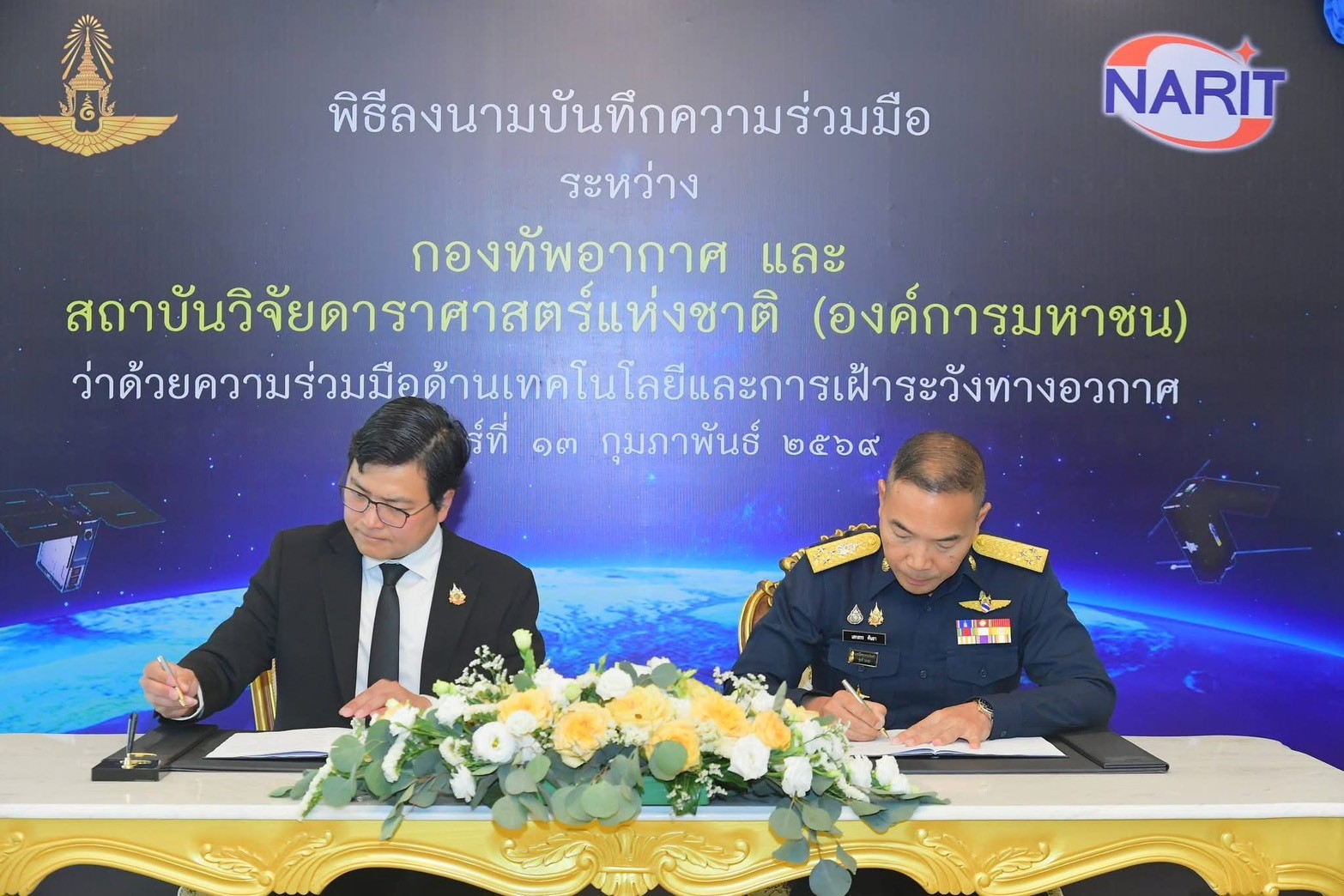 สถาบันวิจัยดาราศาสตร์แห่งชาติ (องค์การมหาชน) (สดร.) หรือ NARIT กระทรวงการอุดมศึกษา วิทยาศาสตร์ วิจัย และนวัตกรรม (อว.) โดย ดร. วิภู รุโจปการ ผู้อำนวยการสถาบันวิจัยดาราศาสตร์แห่งชาติ และกองทัพอากาศ (ทอ.) โดย พลอากาศเอก เสกสรร คันธา ผู้บัญชาการทหารอากาศ ลงนามบันทึกข้อตกลงความร่วมมือด้านเทคโนโลยีและการเฝ้าระวังทางอวกาศ เพื่อส่งเสริมศักยภาพด้านเทคโนโลยีและการเฝ้าระวังทางอวกาศ ยกระดับขีดความสามารถในการพัฒนาบุคลากรของประเทศ และสนับสนุนภารกิจด้านความมั่นคงทางอวกาศของชาติ พิธีลงนามจัดขึ้น ณ กองบัญชาการกองทัพอากาศ (บก.ทอ.) เขตดอนเมือง