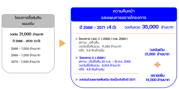 สำหรับเรื่องแรกนั้น ได้แก่ การดำเนินโครงการซื้อหุ้นคืนครั้งที่ 3 ต่อเนื่องจากโครงการครั้งที่ 2 ที่ธนาคารสามารถทำได้เร็วกว่ากำหนดเดิม ส่งผลให้สามารถเลื่อนระยะเวลาของทั้งโครงการ จากภายในปี 2570 มาดำเนินการได้ภายในปี 2569 ภายใต้วงเงินรวม 21,000 ล้านบาท ซึ่งโครงการซื้อหุ้นคืนครั้งที่ 3 นี้ ได้รับการอนุมัติจากคณะกรรมการธนาคารเป็นที่เรียบร้อยแล้ว โดยธนาคารจะนำวงเงินส่วนที่เหลือจากโครงการครั้งที่ 1 และ 2 มูลค่า 9,614 ล้านบาท มาใช้ในการซื้อหุ้นคืน เริ่มตั้งแต่วันที่ 20 กุมภาพันธ์ 2569 ถึงวันที่ 19 สิงหาคม 2569 ผ่านระบบซื้อขายของตลาดหลักทรัพย์ด้วยวิธีจับคู่อัตโนมัติ สะท้อนการบริหารแผน Capital Management อย่างมีประสิทธิภาพ โดยคำนึงถึงประโยชน์สูงสุดต่อผู้ถือหุ้น