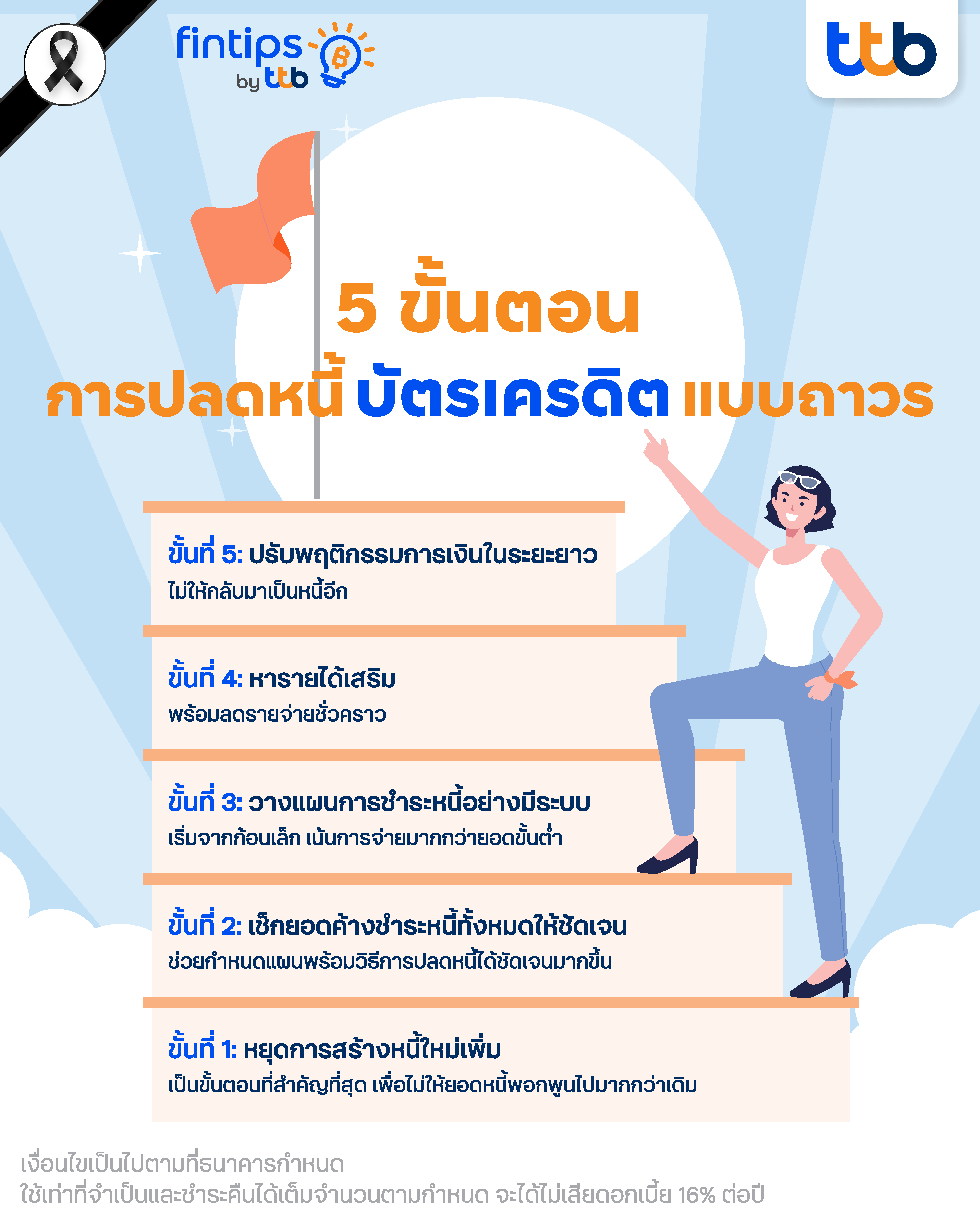ปัญหาหนี้บัตรเครดิตเป็นเรื่องที่หลาย ๆ คนที่พบเจอ และบางครั้งก็รู้สึกเหมือนเป็นวงจรที่ไม่มีวันจบสิ้น นั่นเป็นเพราะดอกเบี้ยสูงถึง 16% ต่อปี และถ้าหากไม่ได้วางแผนจัดการอย่างเป็นระบบก็จะกลายเป็นภาระสะสมเพิ่มขึ้นเรื่อย ๆ ไม่จบไม่สิ้น แต่อย่างไรก็ตาม การปลดหนี้บัตรเครดิตให้หมดไปนั้นไม่ใช่เรื่องที่เป็นไปไม่ได้ หากรู้จักการวางแผนและปรับเปลี่ยนพฤติกรรมการเงินอย่างจริงจัง วันนี้ fintips by ttb #เรื่องเงินที่รู้จริงแบบเพื่อนที่รู้ใจ จะมาแนะนำ 5 ขั้นตอนสำคัญ ที่ช่วยให้ปลดหนี้บัตรเครดิตได้แบบถาวร และไม่กลับไปเป็นหนี้ซ้ำอีก
