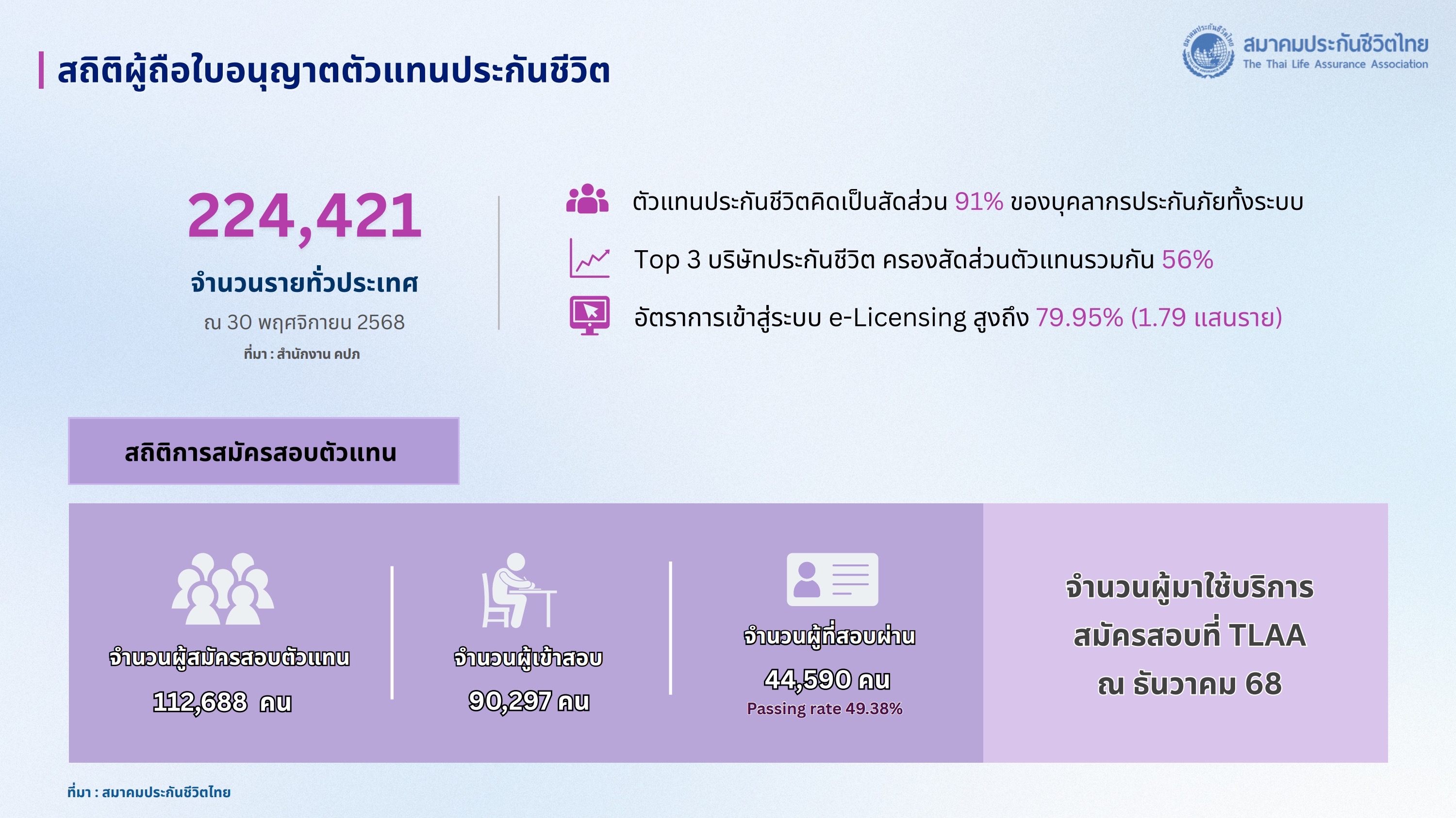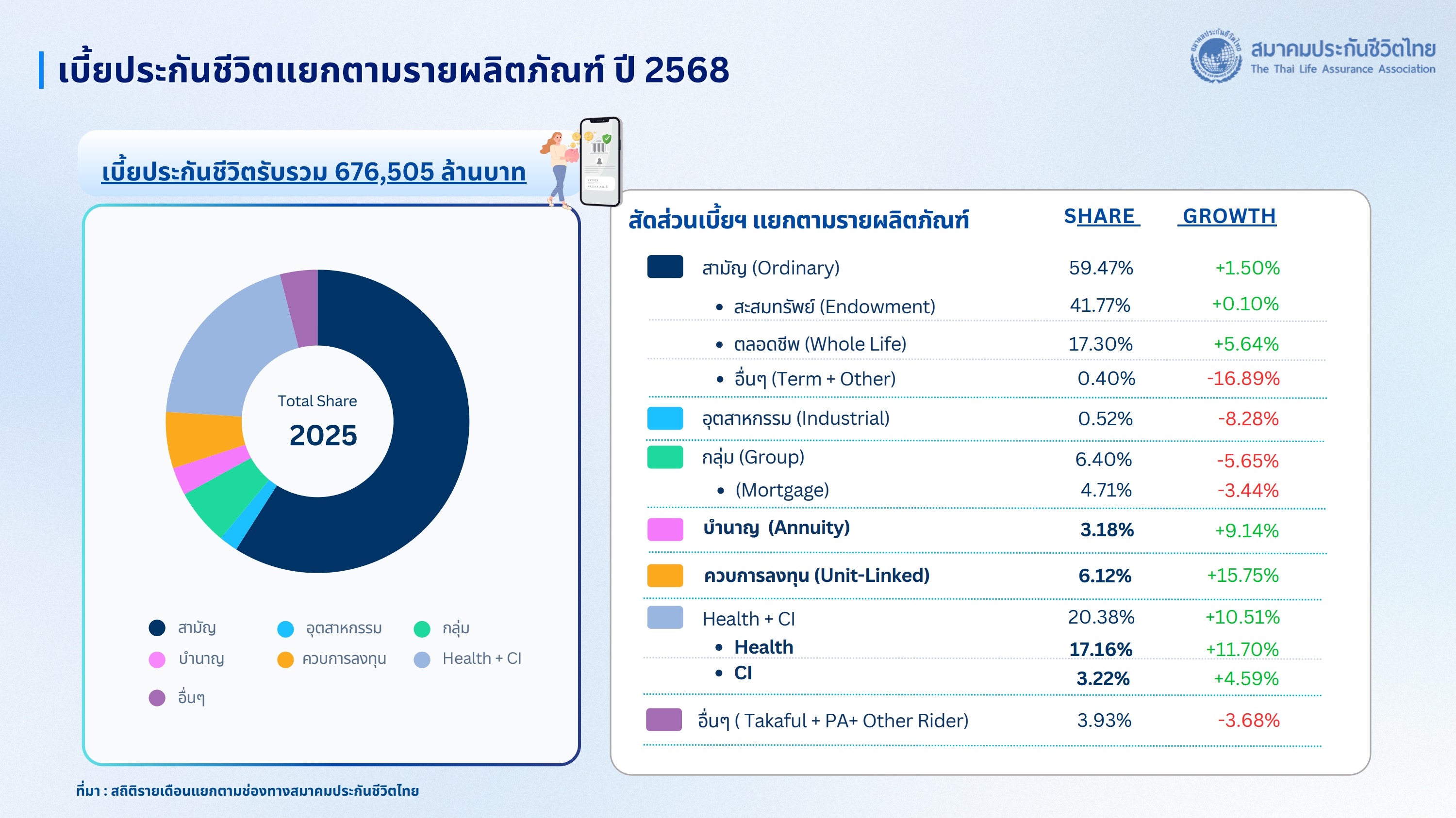 นางนุสรา (อัสสกุล) บัญญัติปิยพจน์ นายกสมาคมประกันชีวิตไทย เปิดเผยว่า เผยภาพรวมธุรกิจประกันชีวิตของปี 2568 ระหว่าง มกราคม - ธันวาคม มีเบี้ยประกันภัยรับรวม (Total Premium) อยู่ที่ 676,505 ล้านบาท เติบโตเพิ่มขึ้นร้อยละ 3.45 เมื่อเทียบกับปี 2567 จำแนกเป็น เบี้ยประกันภัยรับรายใหม่ (New Business Premium) 190,886 ล้านบาท อัตราการเติบโตเพิ่มขึ้นร้อยละ 3.60 และเบี้ยประกันภัยรับปีต่อไป (Renewal Premium) 485,619 ล้านบาทมีอัตราการเติบโตเพิ่มขึ้นร้อยละ 3.40 คิดเป็นอัตราความคงอยู่ของกรมธรรม์ร้อยละ 82